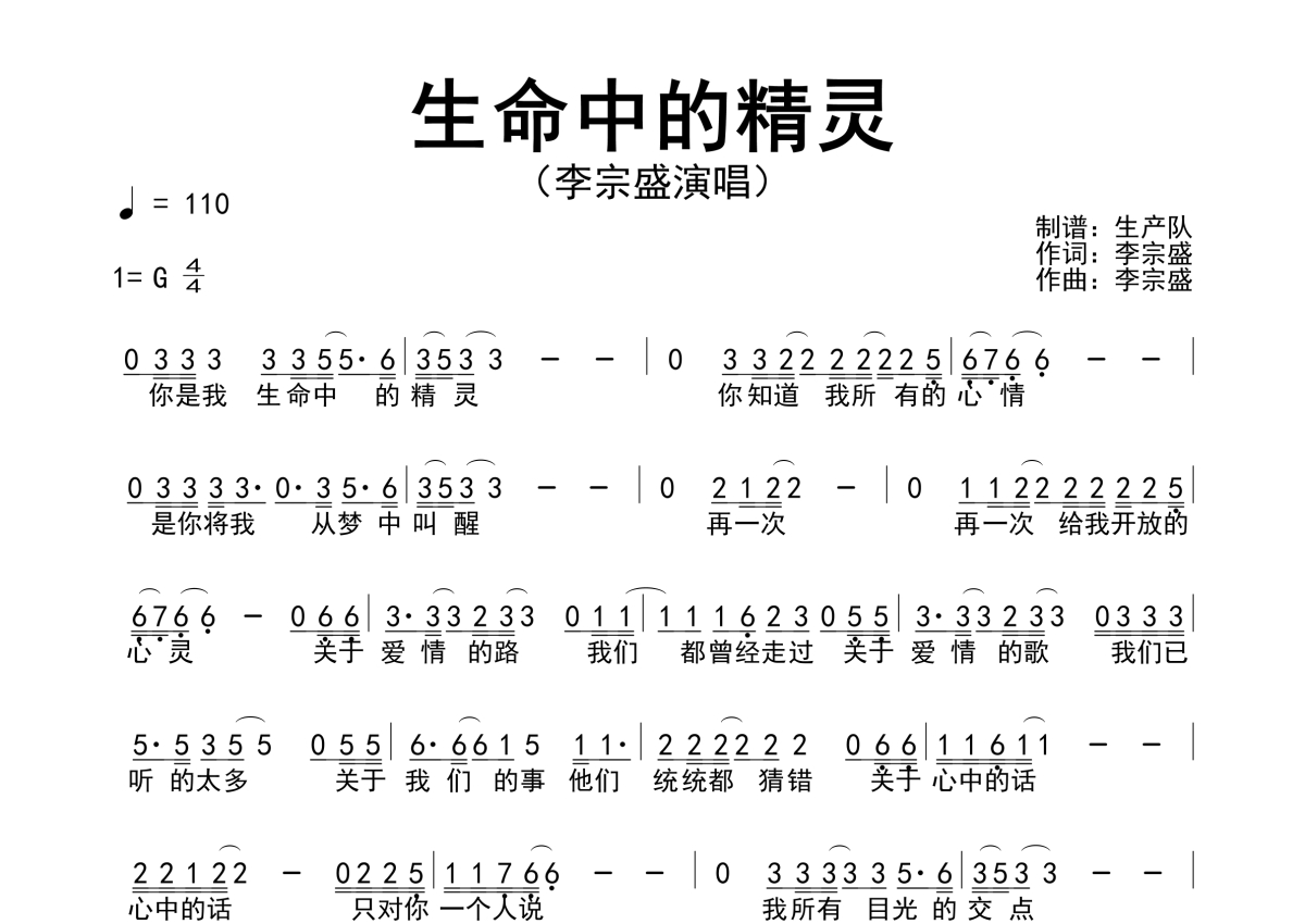 《生命中的精灵》是李宗盛演唱的一首歌曲,简谱,拍号为4/4拍,歌曲速度为每分钟110拍,这份简谱共有一张高清图谱,图谱由 @生产队 编配上传李宗盛演唱的歌曲《生命中的精灵》简谱。