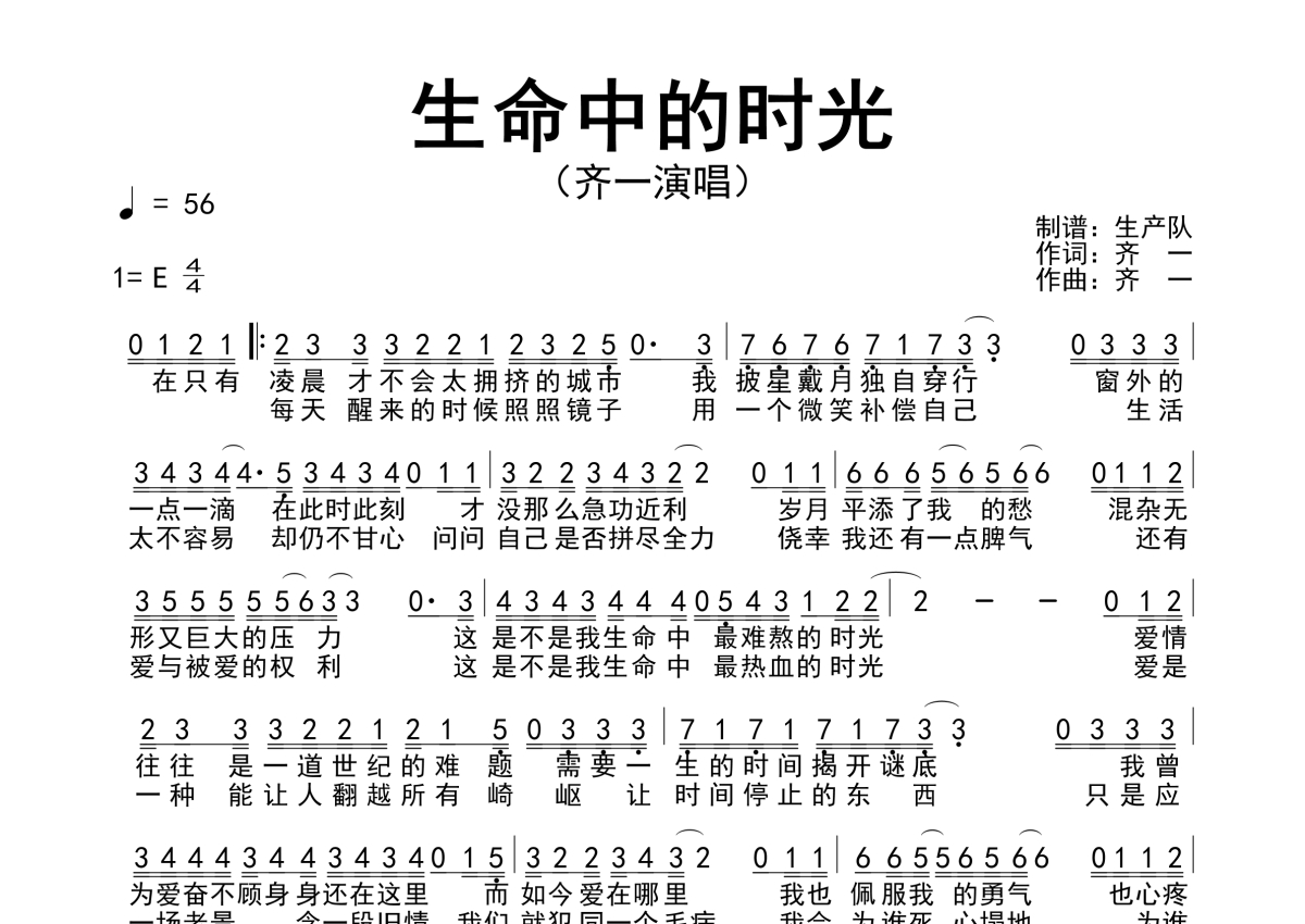 《生命中的时光》是齐一演唱的一首歌曲,简谱,拍号为4/4拍,歌曲速度为每分钟56拍,这份简谱共有一张高清图谱,图谱由 @生产队 编配上传齐一演唱的歌曲《生命中的时光》简谱。