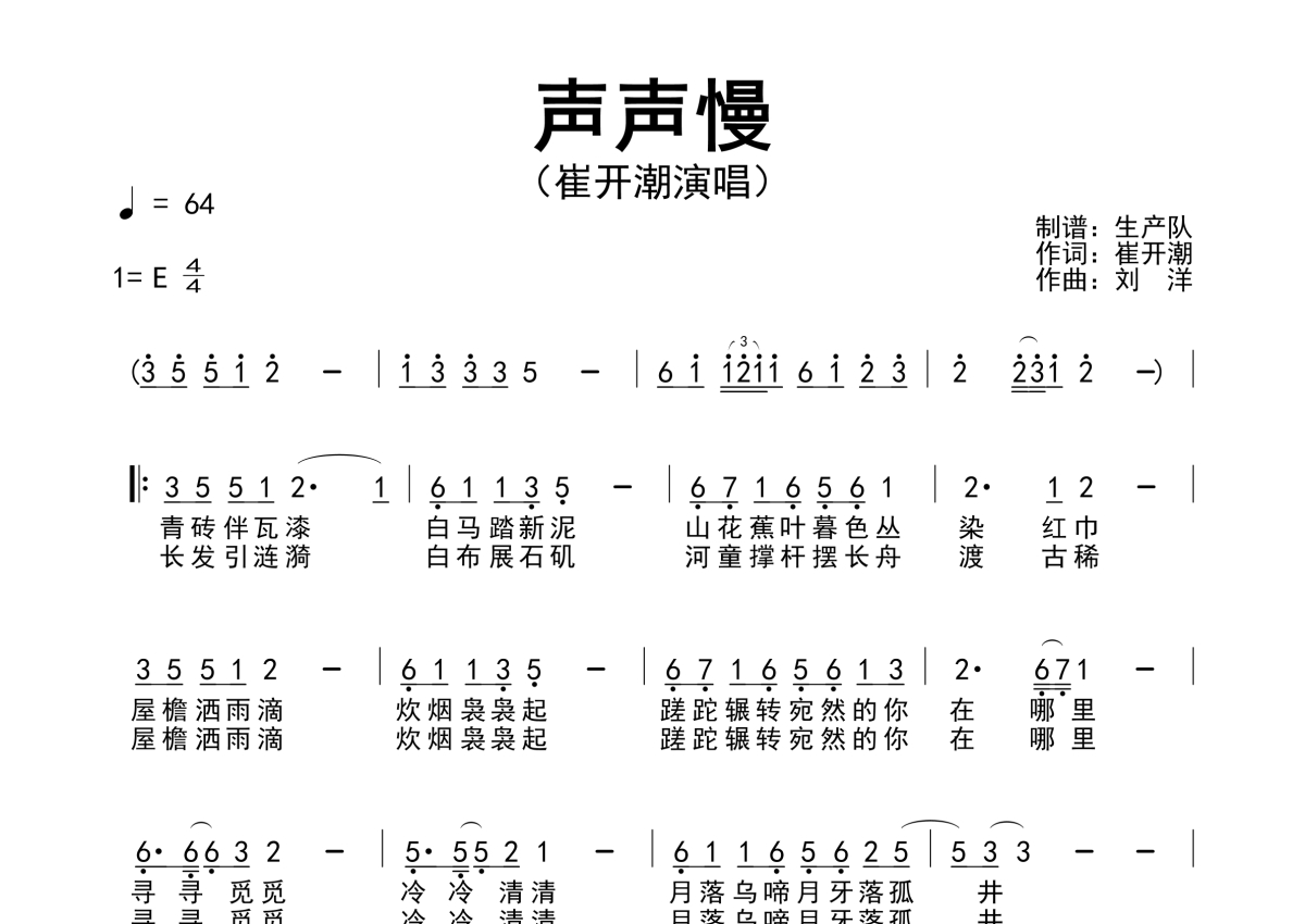 《声声慢》是崔开潮演唱的一首歌曲,简谱,拍号为4/4拍,歌曲速度为每分钟64拍,这份简谱共有一张高清图谱,图谱由 @生产队 编配上传崔开潮演唱的歌曲《声声慢》简谱。