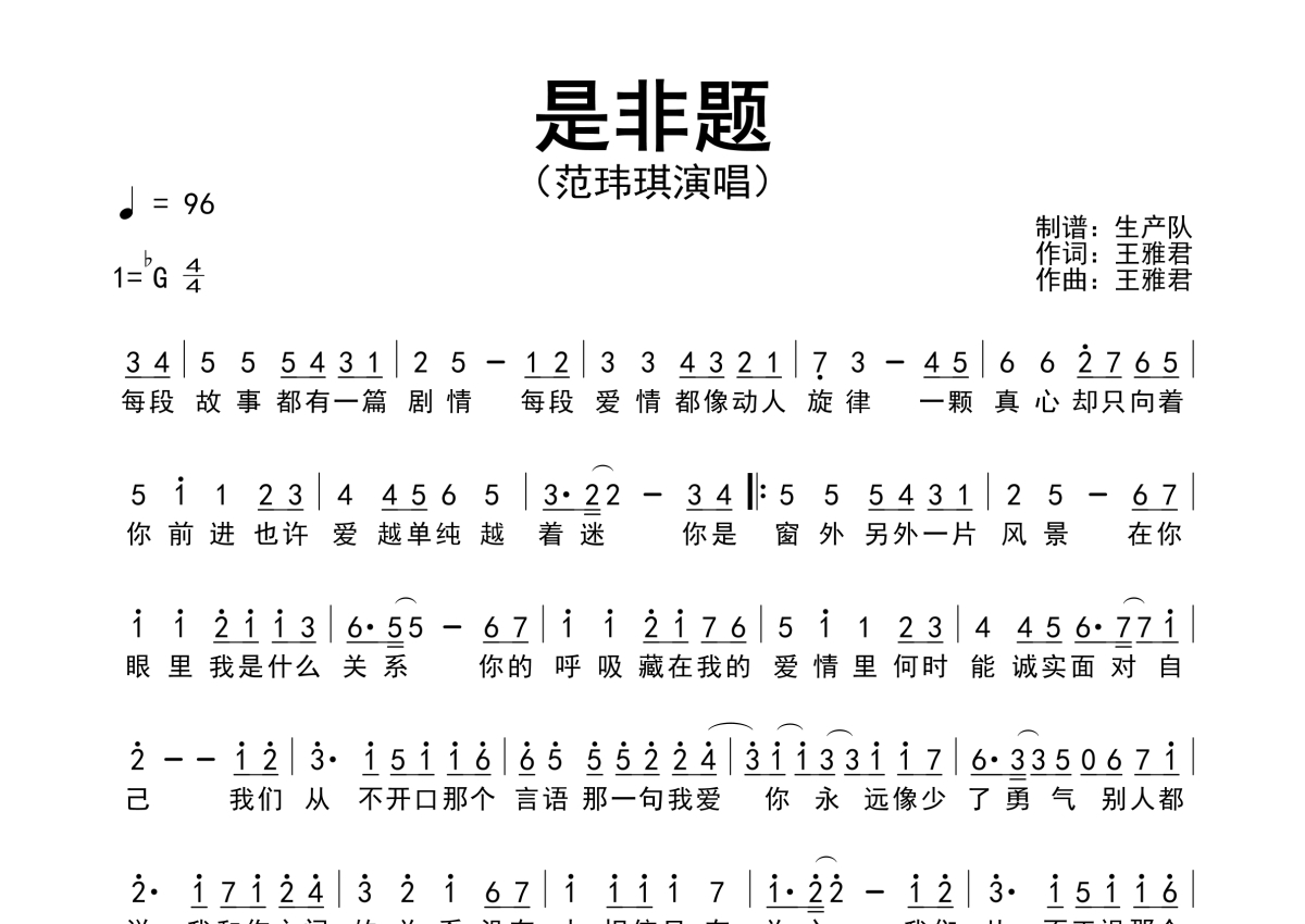 《是非题》是范玮琪演唱的一首歌曲,简谱,拍号为4/4拍,歌曲速度为每分钟96拍,这份简谱共有一张高清图谱,图谱由 @生产队 编配上传范玮琪演唱的歌曲《是非题》简谱。