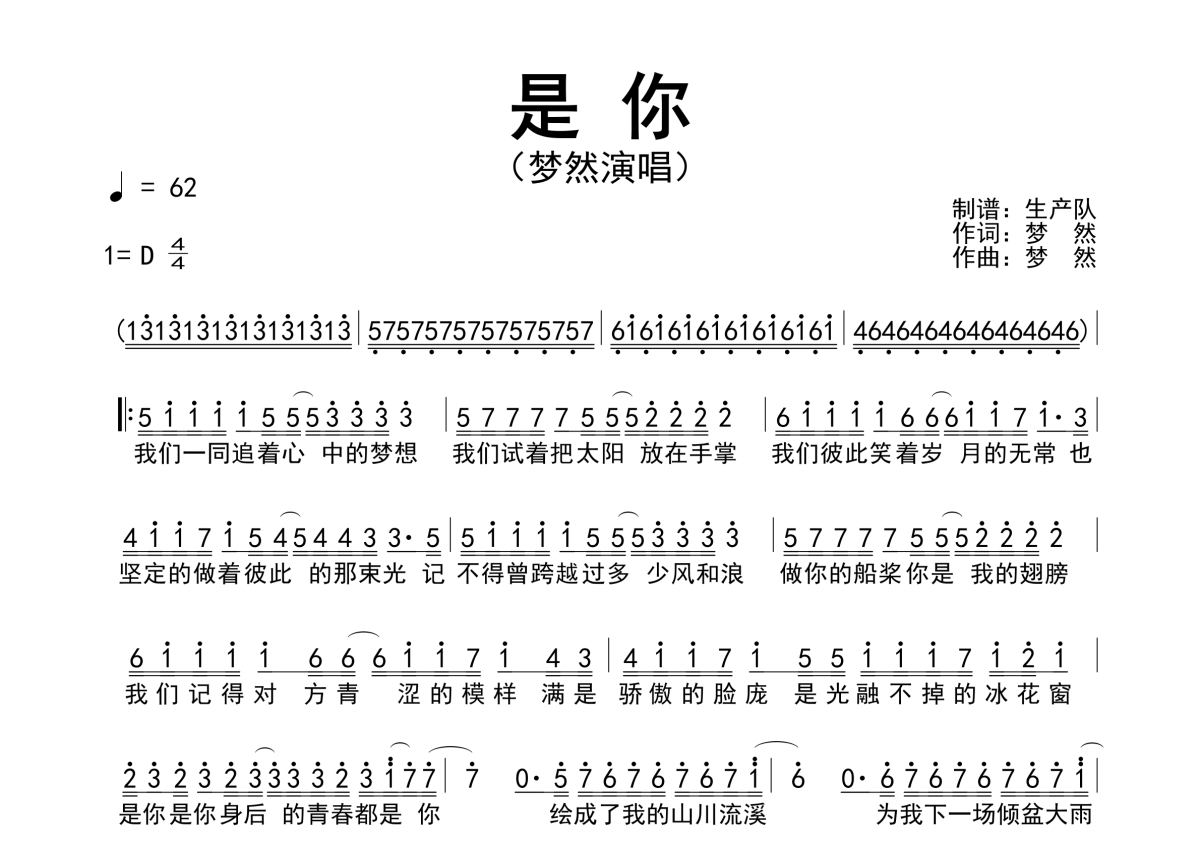 《是你》是梦然演唱的一首歌曲,简谱,拍号为4/4拍,歌曲速度为每分钟62拍,这份简谱共有一张高清图谱,图谱由 @生产队 编配上传梦然演唱的歌曲《是你》简谱。