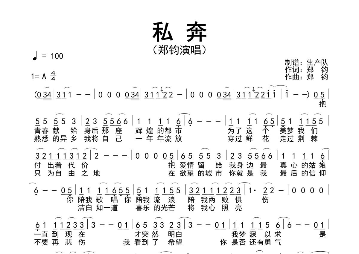 《私奔》是郑钧演唱的一首歌曲,简谱,拍号为4/4拍,歌曲速度为每分钟100拍,这份简谱共有一张高清图谱,图谱由 @生产队 编配上传郑钧演唱的歌曲《私奔》简谱。