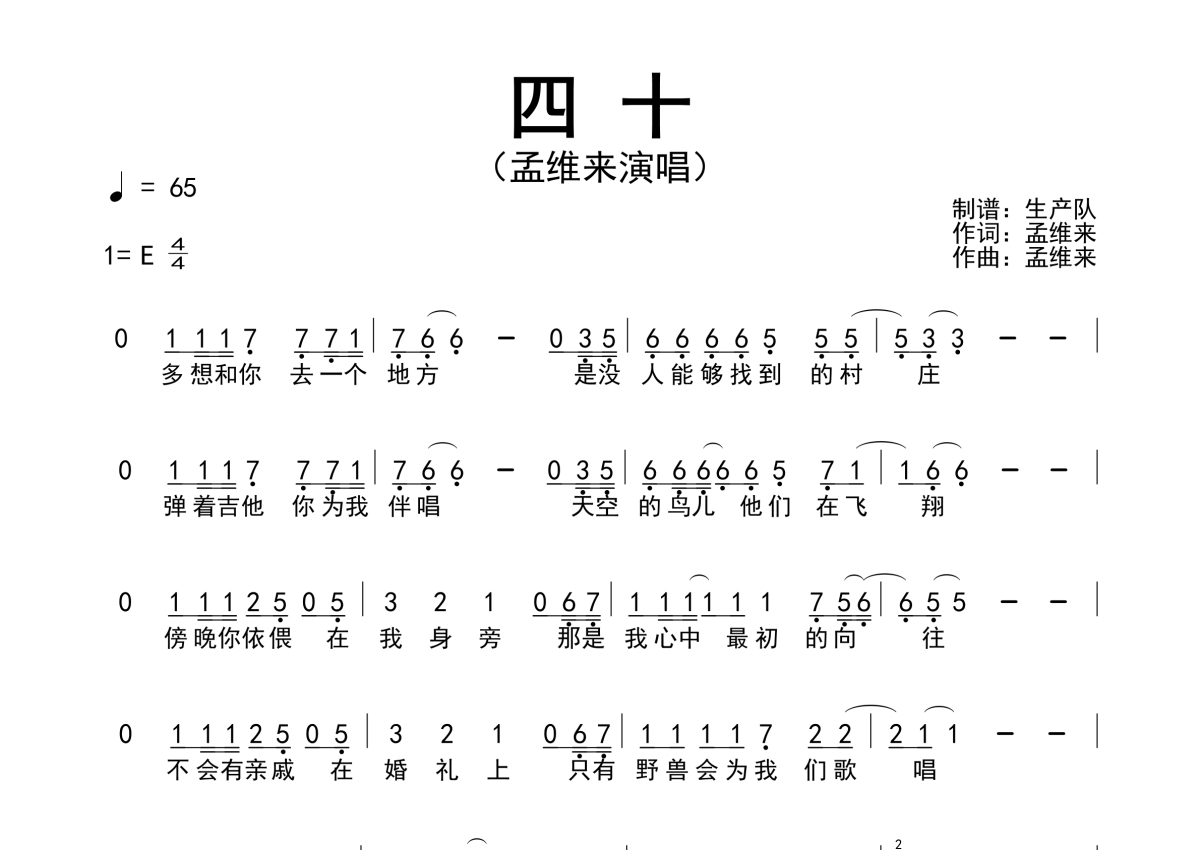 《四十》是孟维来演唱的一首歌曲,简谱,拍号为4/4拍,歌曲速度为每分钟65拍,这份简谱共有一张高清图谱,图谱由 @生产队 编配上传孟维来演唱的歌曲《四十》简谱。