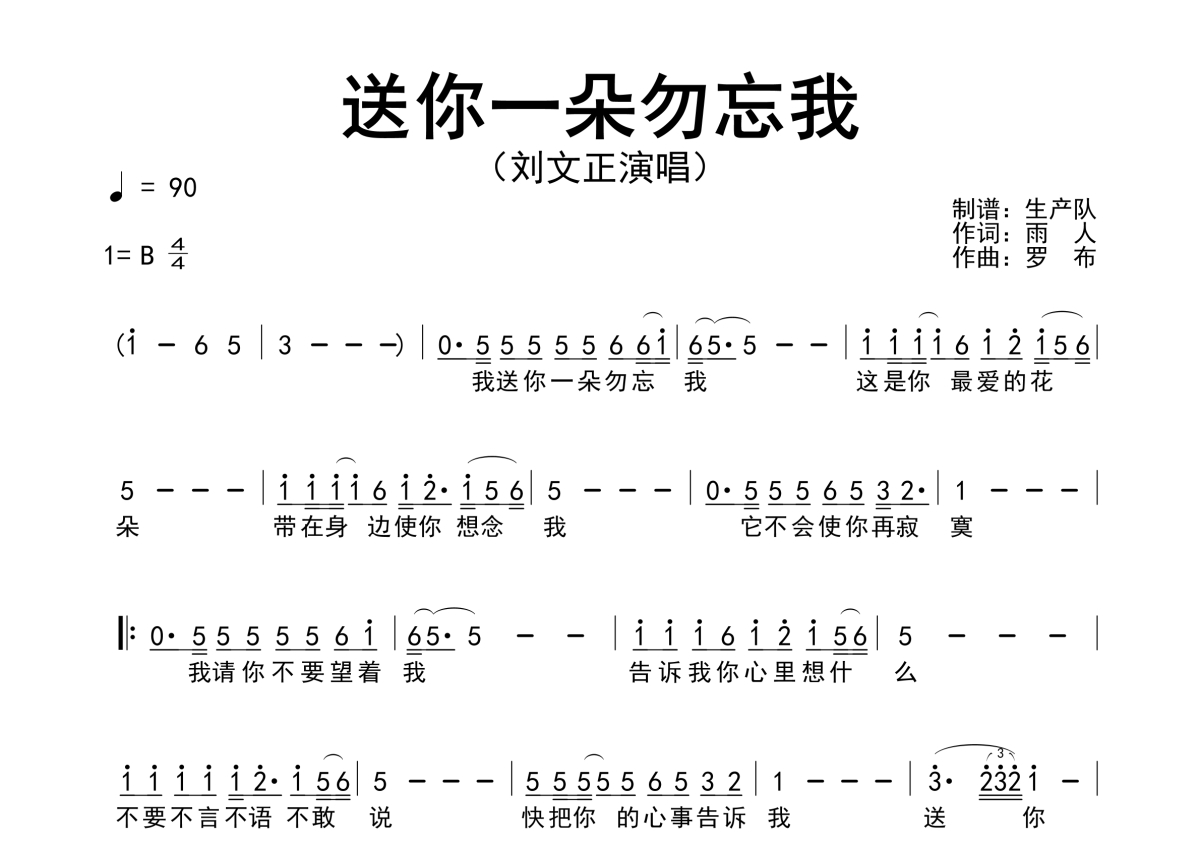 《送你一朵勿忘我》是刘文正演唱的一首歌曲,简谱,拍号为4/4拍,歌曲速度为每分钟90拍,这份简谱共有一张高清图谱,图谱由 @生产队 编配上传刘文正演唱的歌曲《送你一朵勿忘我》简谱。