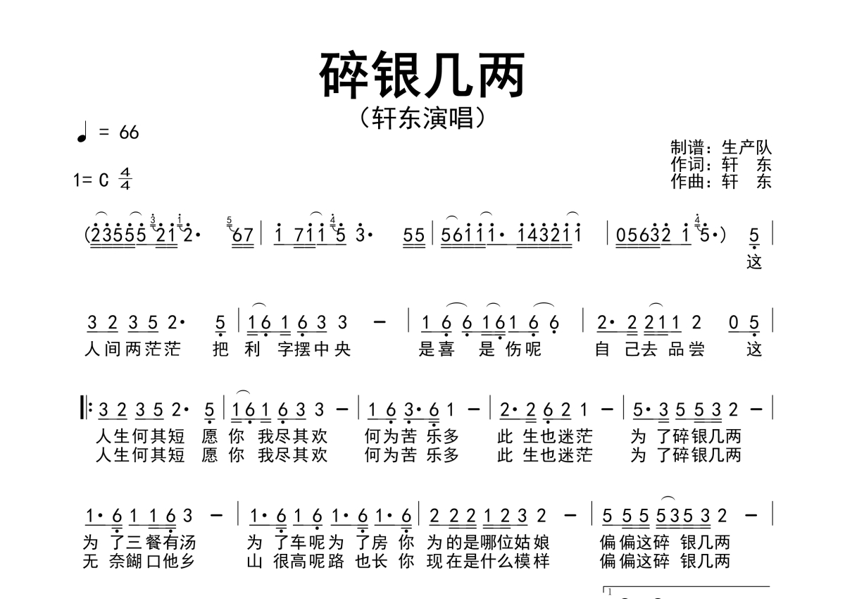 《碎银几两》是轩东演唱的一首歌曲,简谱,拍号为4/4拍,歌曲速度为每分钟66拍,这份简谱共有一张高清图谱,图谱由 @生产队 编配上传轩东演唱的歌曲《碎银几两》简谱。