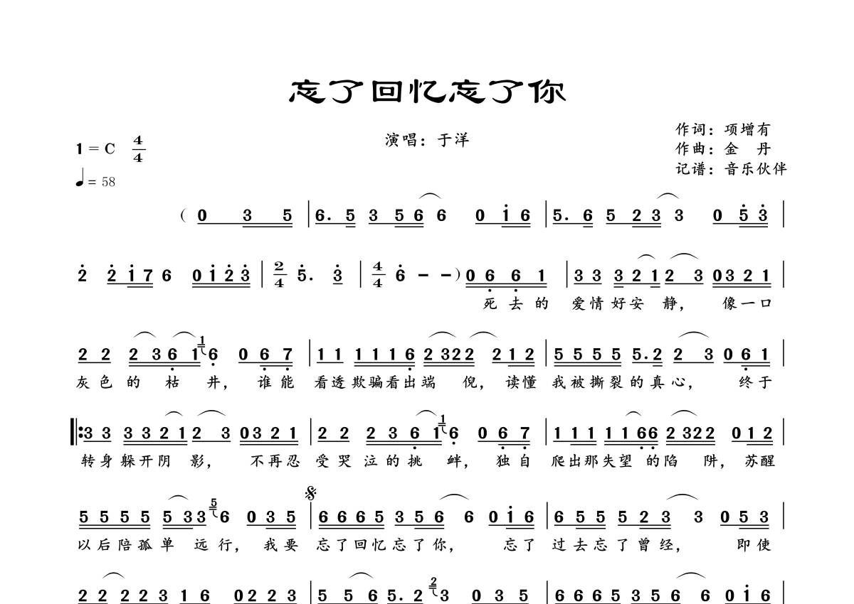 《忘了回忆忘了你》是于洋演唱的一首歌曲,拍号为4/4拍,歌曲速度为每分钟58拍,这份简谱共有一张高清图谱,图谱由 @音乐伙伴 编配上传。