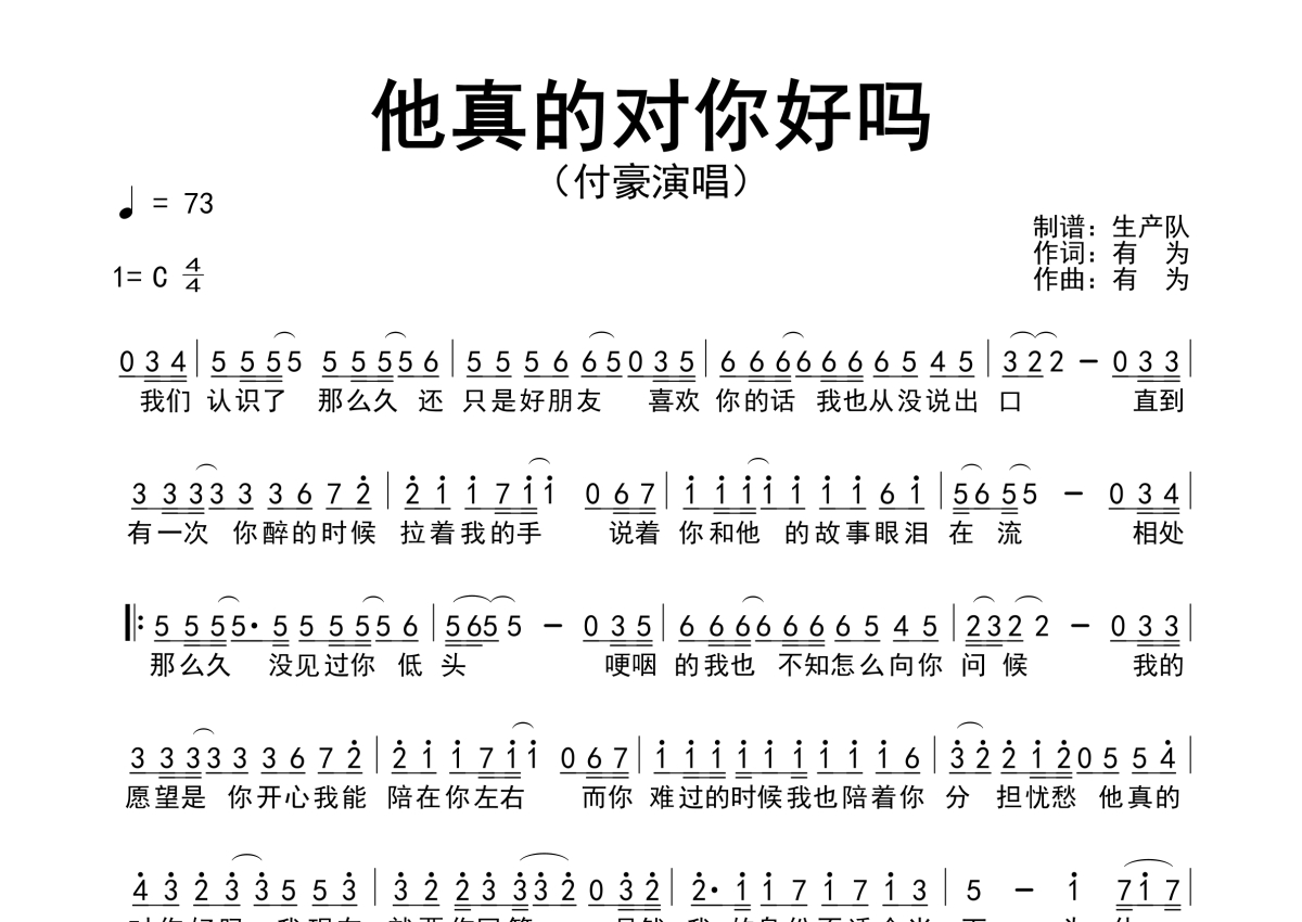 《他真的对你好吗》是付豪演唱的一首歌曲,拍号为4/4拍,歌曲速度为每分钟73拍,这份简谱共有一张高清图谱,图谱由 @生产队 编配上传付豪演唱的歌曲《他真的对你好吗》简谱。