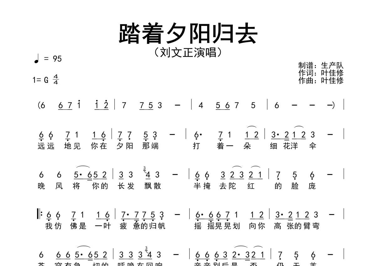 《踏着夕阳归去》是刘文正演唱的一首歌曲,拍号为4/4拍,歌曲速度为每分钟95拍,这份简谱共有一张高清图谱,图谱由 @生产队 编配上传刘文正演唱的歌曲《踏着夕阳归去》简谱。