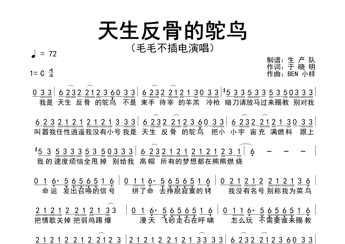 《天生反骨的鸵鸟》是毛毛不插电演唱的一首歌曲,简谱,拍号为4/4拍,歌曲速度为每分钟72拍,这份简谱共有一张高清图谱,图谱由 @生产队 编配上传毛毛不插电演唱的歌曲《天生反骨的鸵鸟》简谱。