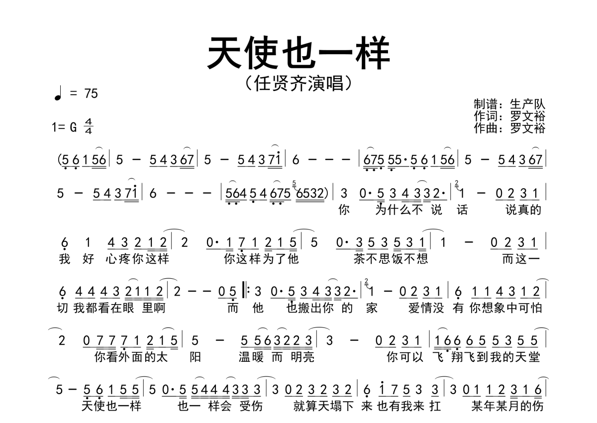 《天使也一样》是任贤齐演唱的一首歌曲,简谱,拍号为4/4拍,歌曲速度为每分钟75拍,这份简谱共有一张高清图谱,图谱由 @生产队 编配上传任贤齐演唱的歌曲《天使也一样》简谱。