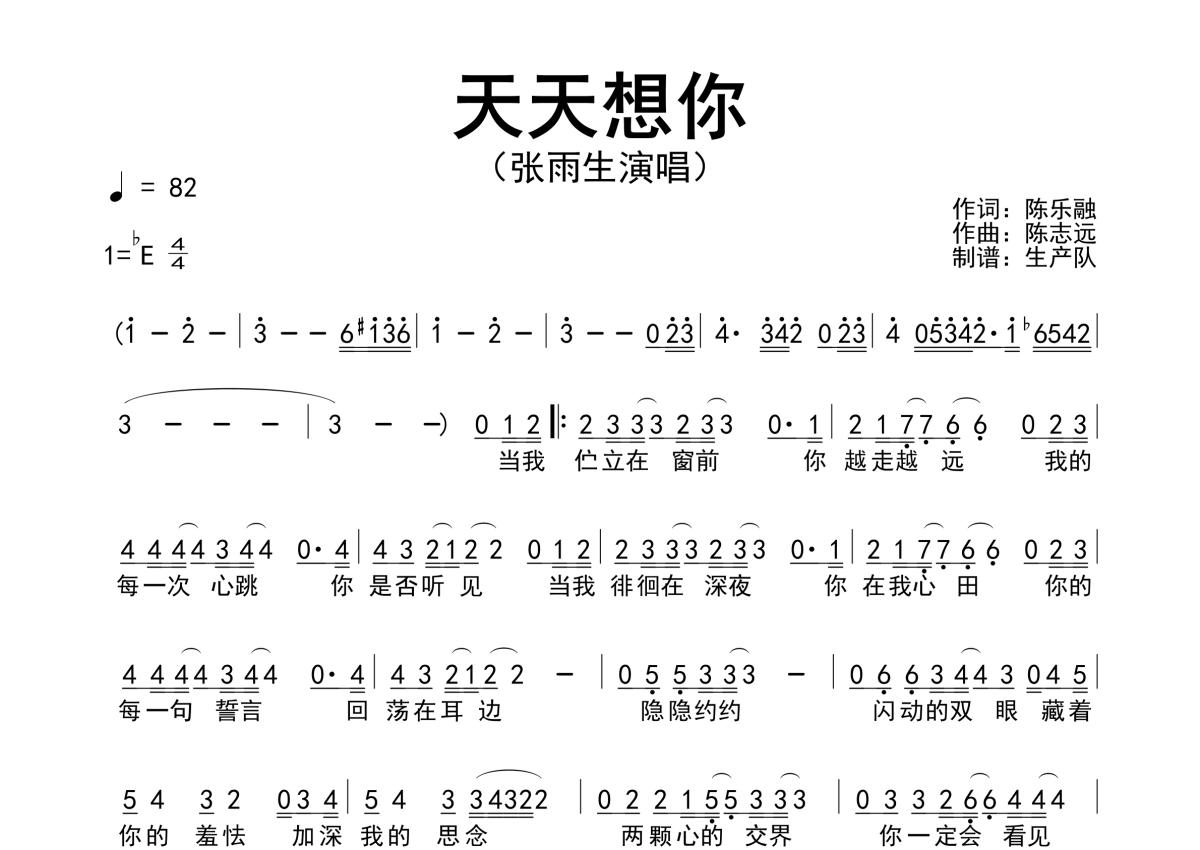《天天想你》是张雨生演唱的一首歌曲,简谱,拍号为4/4拍,歌曲速度为每分钟82拍,这份简谱共有一张高清图谱,图谱由 @生产队 编配上传张雨生演唱的歌曲《天天想你》简谱。