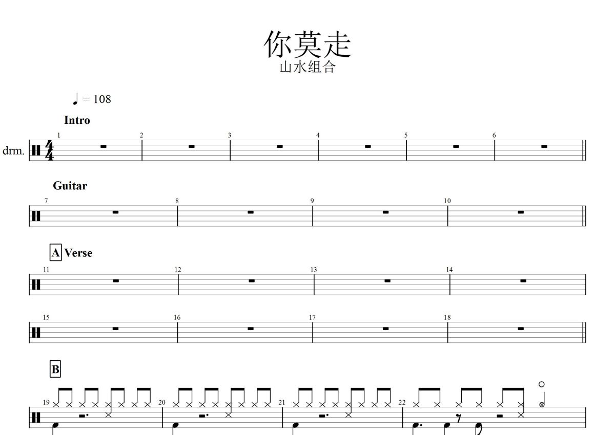 《你莫走》是山水组合演唱的一首歌曲,这份鼓谱共有三张高清图谱,图谱由 @打鼓谱 编配上传,图谱使用五线谱编配,使用这份你莫走架子鼓谱,你将能够轻松地敲打出这首山水组合的你莫走,快来尝试吧。《你莫走》是一首由许勇作词,舒维作曲,山水组合演唱的歌曲。