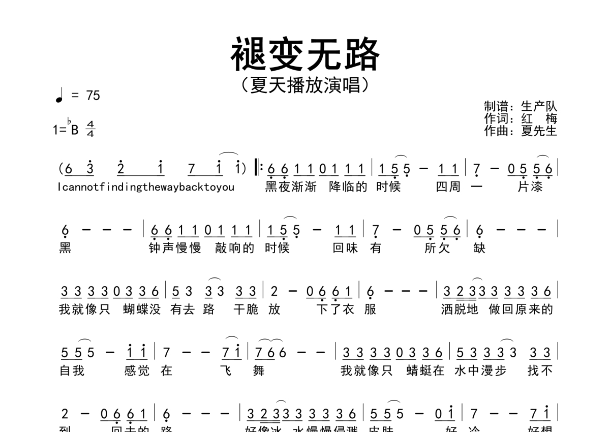 《褪变无路》是夏天播放演唱的一首歌曲,简谱,拍号为4/4拍,歌曲速度为每分钟75拍,这份简谱共有一张高清图谱,图谱由 @生产队 编配上传夏天播放演唱的歌曲《褪变无路》简谱。