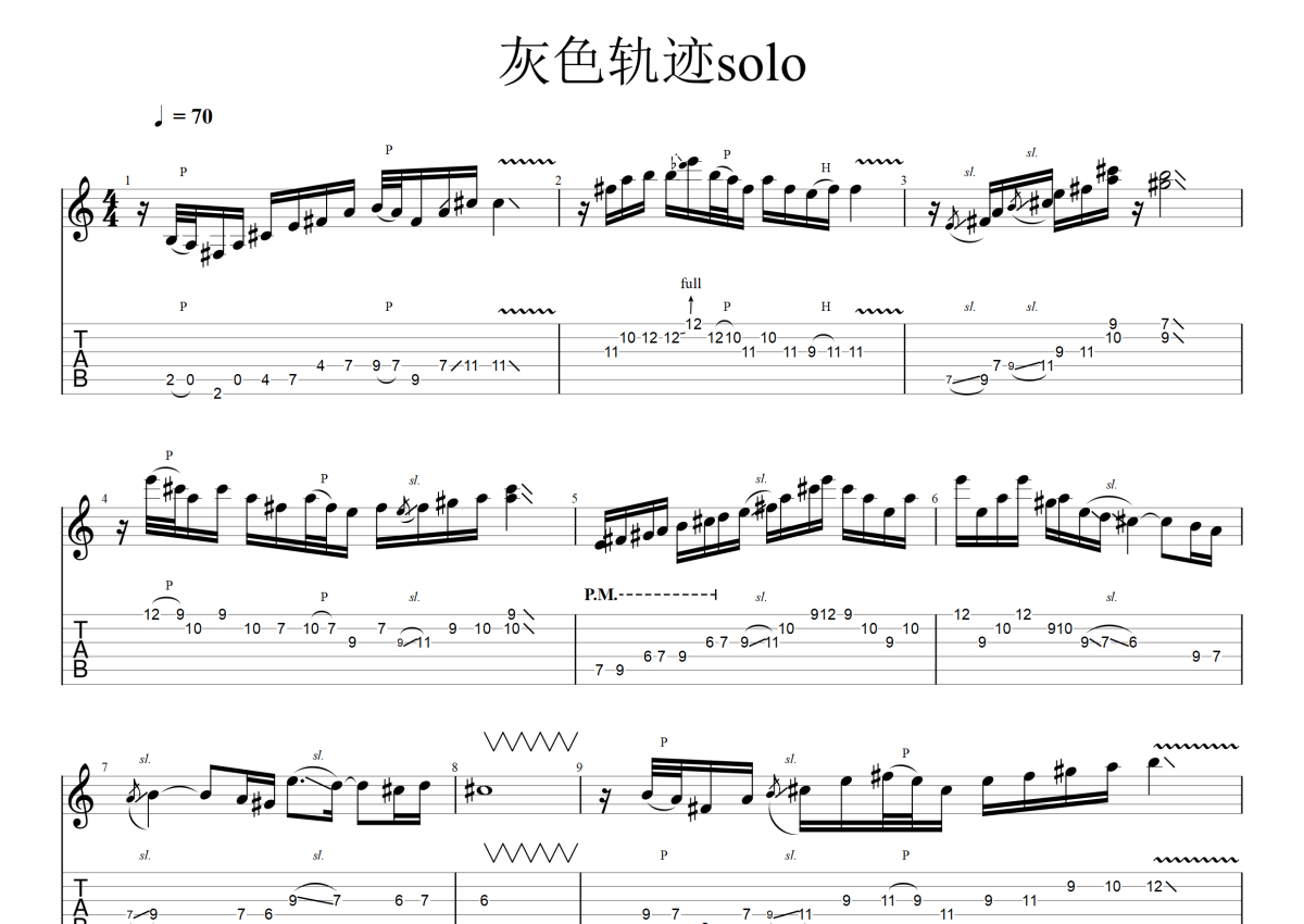 《灰色轨迹solo》是beyond演唱的一首歌曲,电吉他独奏版,拍号为4/4拍,歌曲速度为每分钟70拍,歌曲原调为A调,演奏时不需要使用变调夹即为原调,这份电吉他谱共有两张高清图谱,图谱由 @mono 编配上传,图谱使用六线谱编配,曲谱配备了相关的音频提供试听,使用这份灰色轨迹solo电吉他谱,可以让你更加方便地掌握这首歌曲的演奏技巧,快来尝试吧。