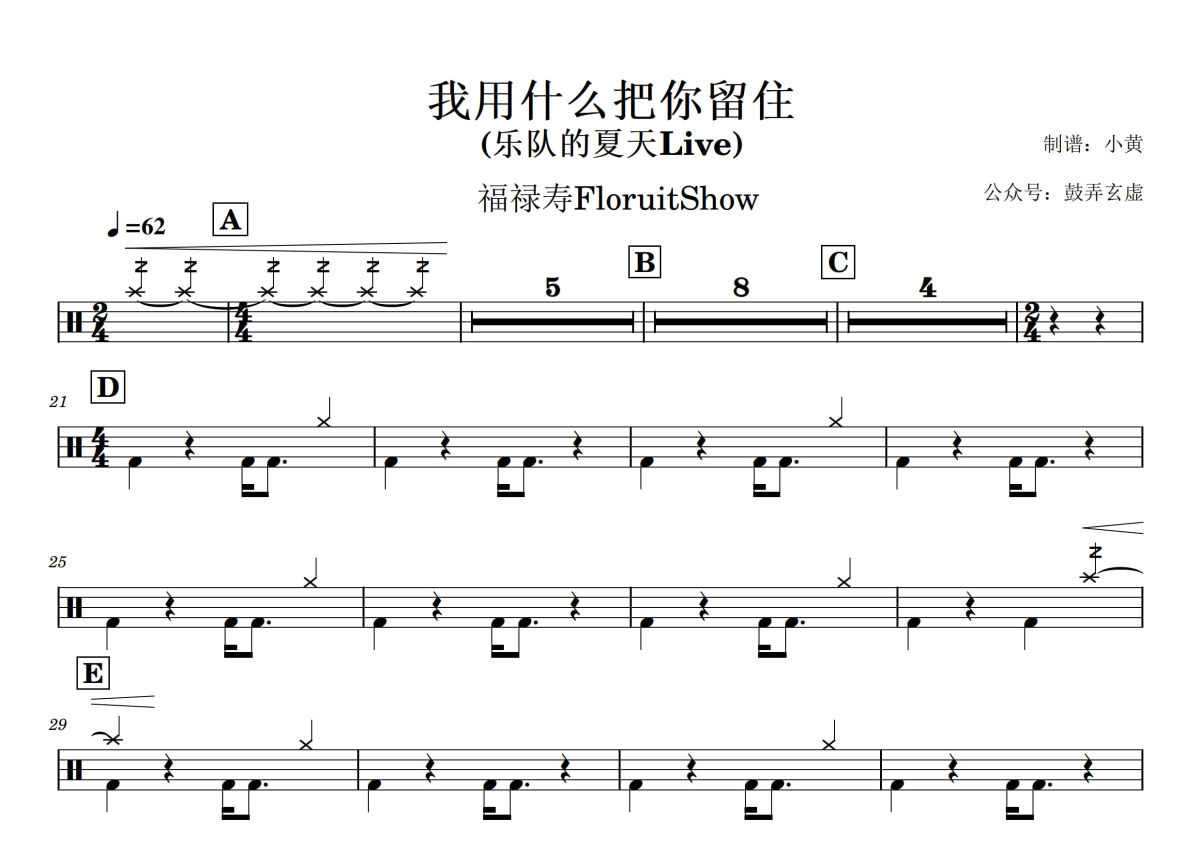 《我用什么把你留住》是福禄寿FloruitShow演唱的一首歌曲,乐队的夏天Live版,拍号为2/4拍,歌曲速度为每分钟62拍,这份架子鼓谱共有三张高清图谱,图谱由 @小黄 编配上传,图谱使用五线谱编配,使用这份我用什么把你留住架子鼓谱,你将能够轻松地敲打出这首福禄寿FloruitShow的我用什么把你留住,快来尝试吧。