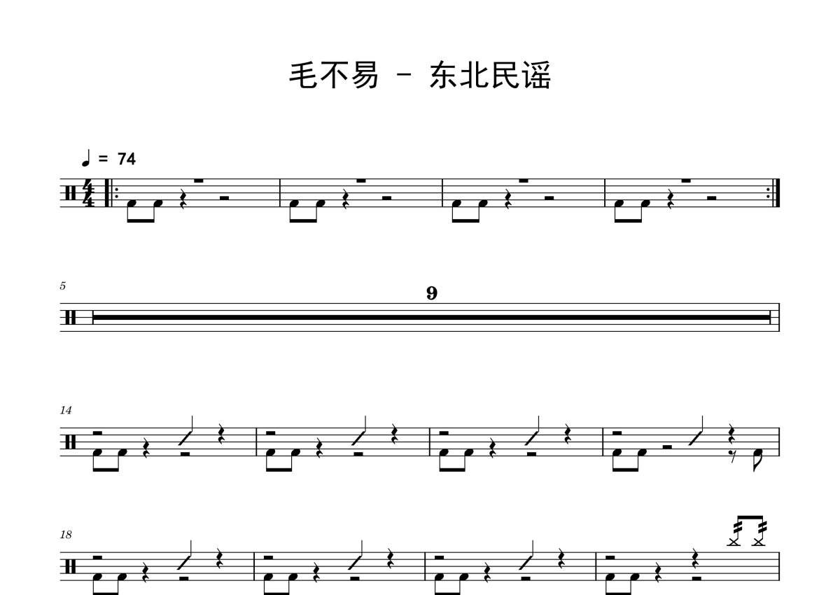 《东北民谣》是毛不易演唱的一首歌曲,拍号为4/4拍,歌曲速度为每分钟74拍,这份架子鼓谱共有两张高清图谱,图谱由 @Sawubona 编配上传,图谱使用五线谱编配,使用这份东北民谣架子鼓谱,你将能够轻松地敲打出这首毛不易的东北民谣,快来尝试吧。