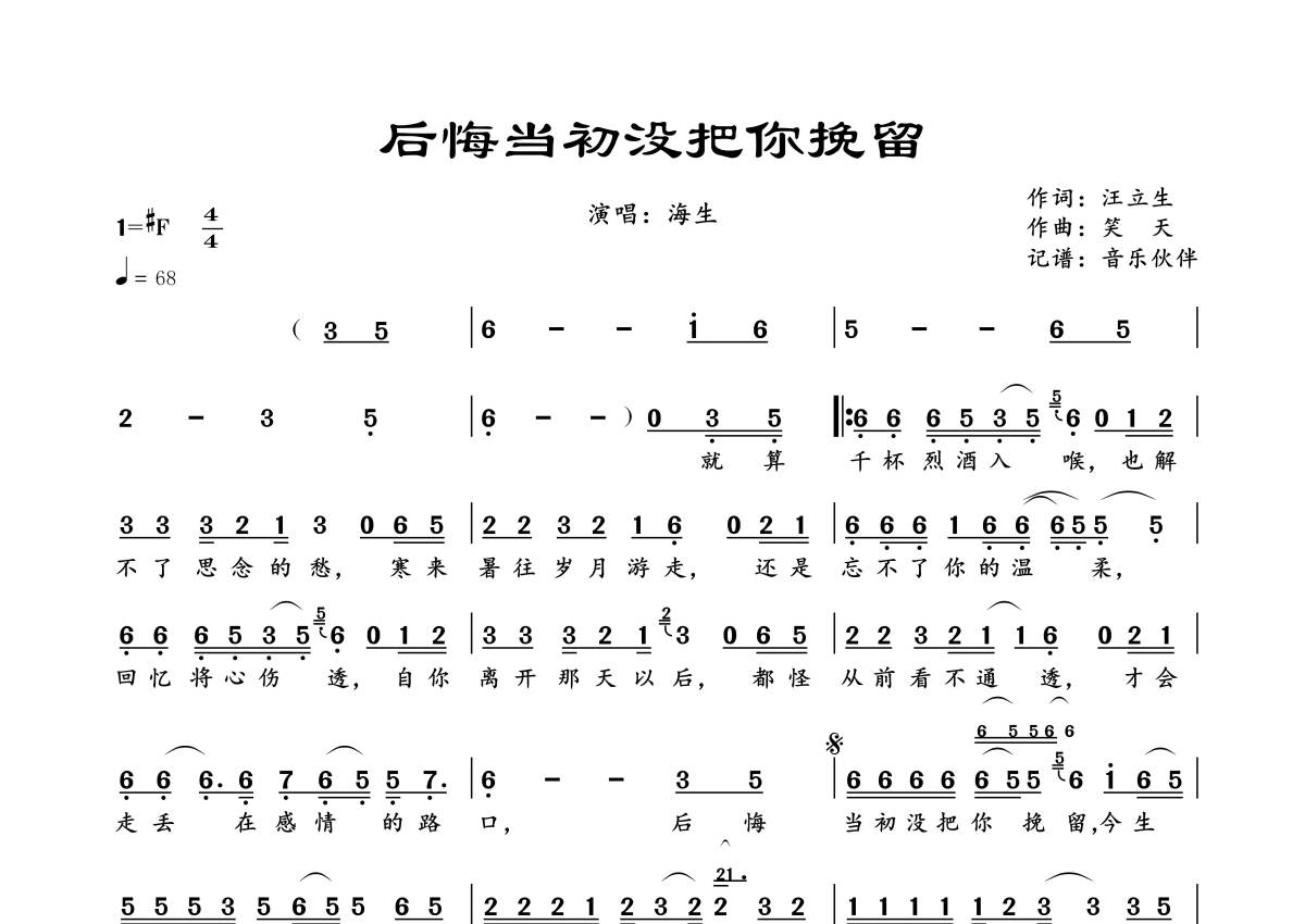 《后悔当初没把你挽留》是海生演唱的一首歌曲,拍号为4/4拍,歌曲速度为每分钟68拍,这份简谱共有一张高清图谱,图谱由 @音乐伙伴 编配上传。