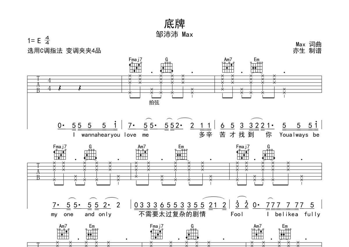 Max/邹沛沛《底牌》吉他谱 - C调弹唱六线谱