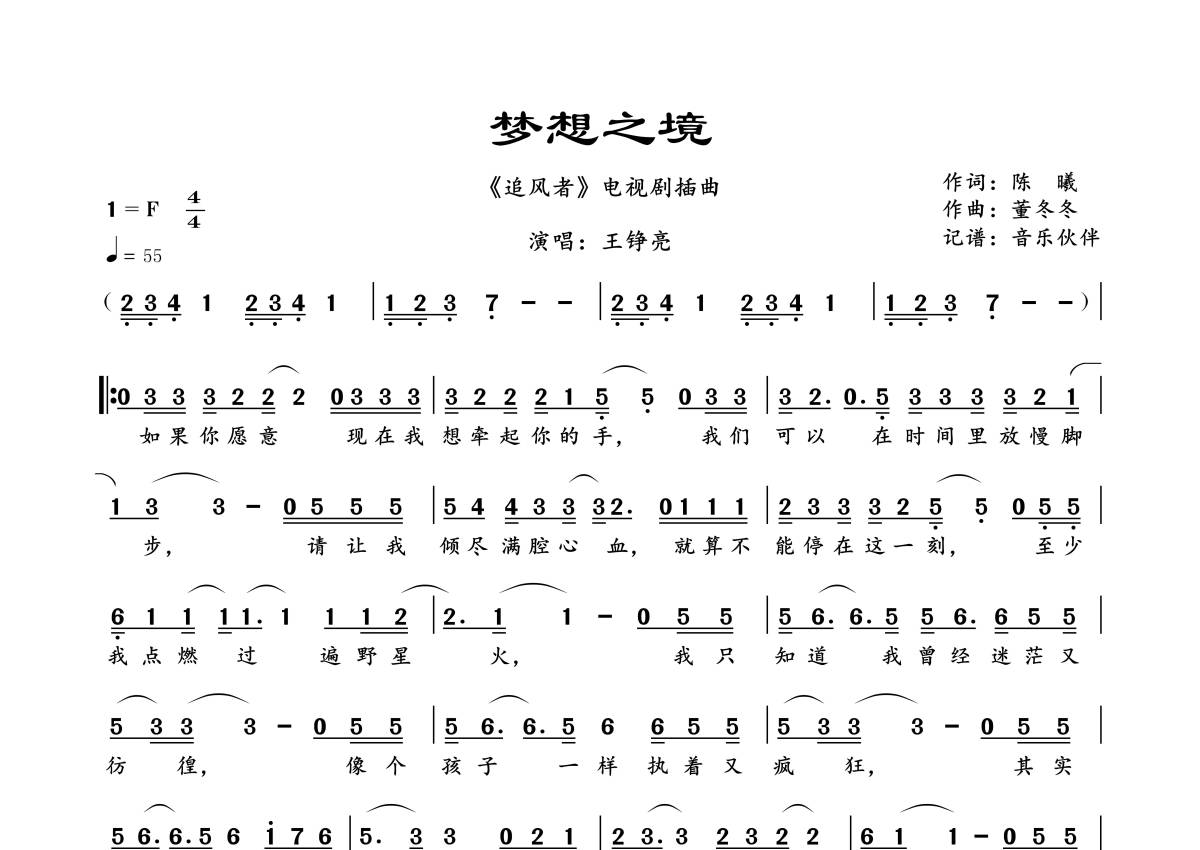 《梦想之境》是王铮亮演唱的一首歌曲,拍号为4/4拍,歌曲速度为每分钟55拍,这份简谱共有一张高清图谱,图谱由 @音乐伙伴 编配上传《追风者》电视剧插曲。