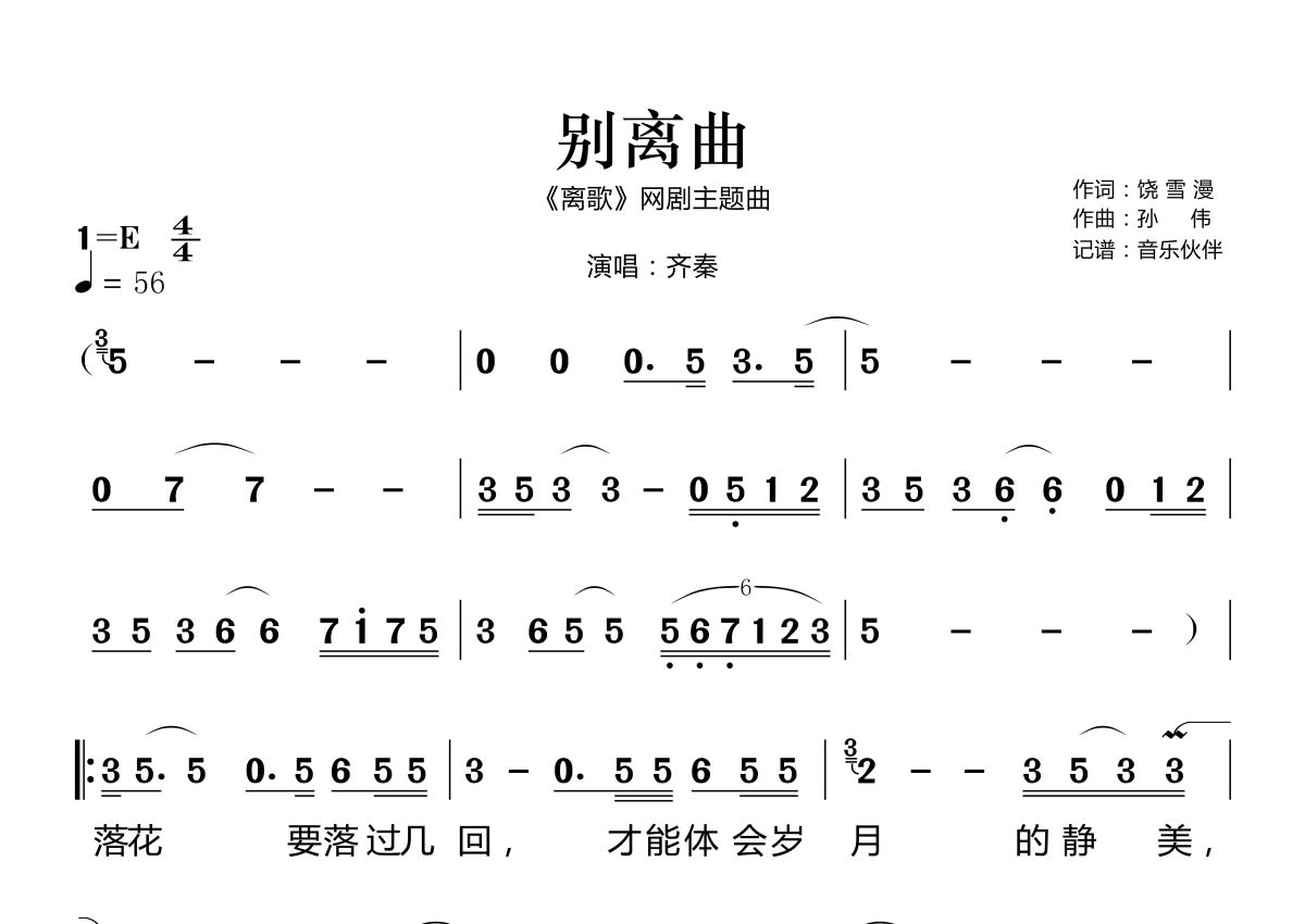 《别离曲》是齐秦演唱的一首歌曲,这份简谱共有两张高清图谱,图谱由 @音乐伙伴 编配上传《离歌》网剧主题曲。