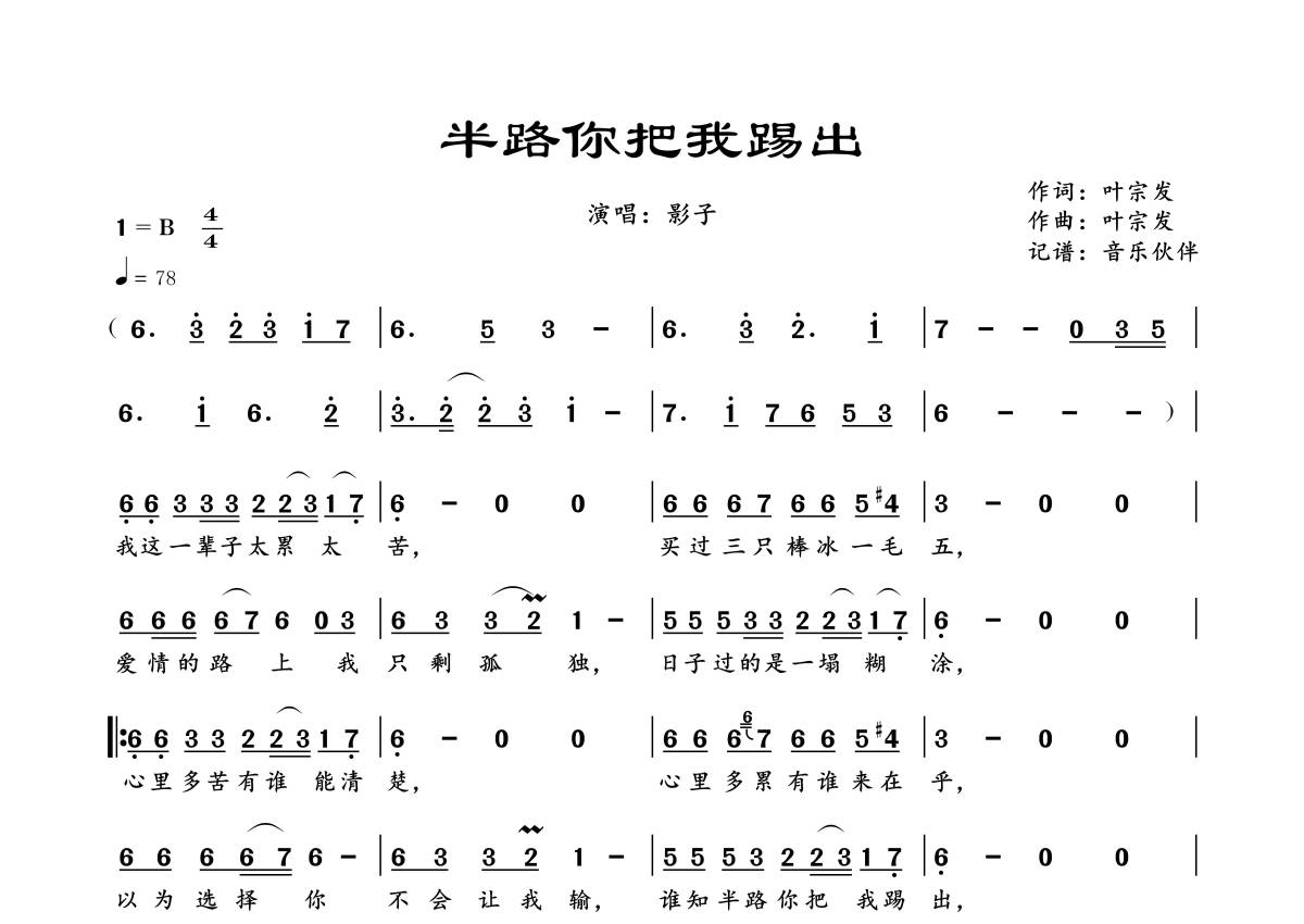 《半路你把我踢出》是影子演唱的一首歌曲,拍号为4/4拍,歌曲速度为每分钟78拍,这份简谱共有一张高清图谱,图谱由 @音乐伙伴 编配上传。