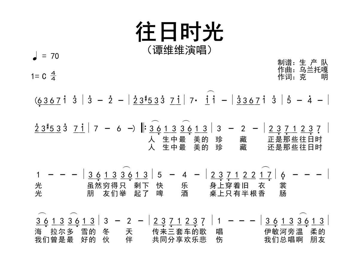 《往日时光》是谭维维演唱的一首歌曲,简谱,拍号为4/4拍,歌曲速度为每分钟70拍,这份简谱共有一张高清图谱,图谱由 @生产队 编配上传谭维维演唱的歌曲《往日时光》简谱。