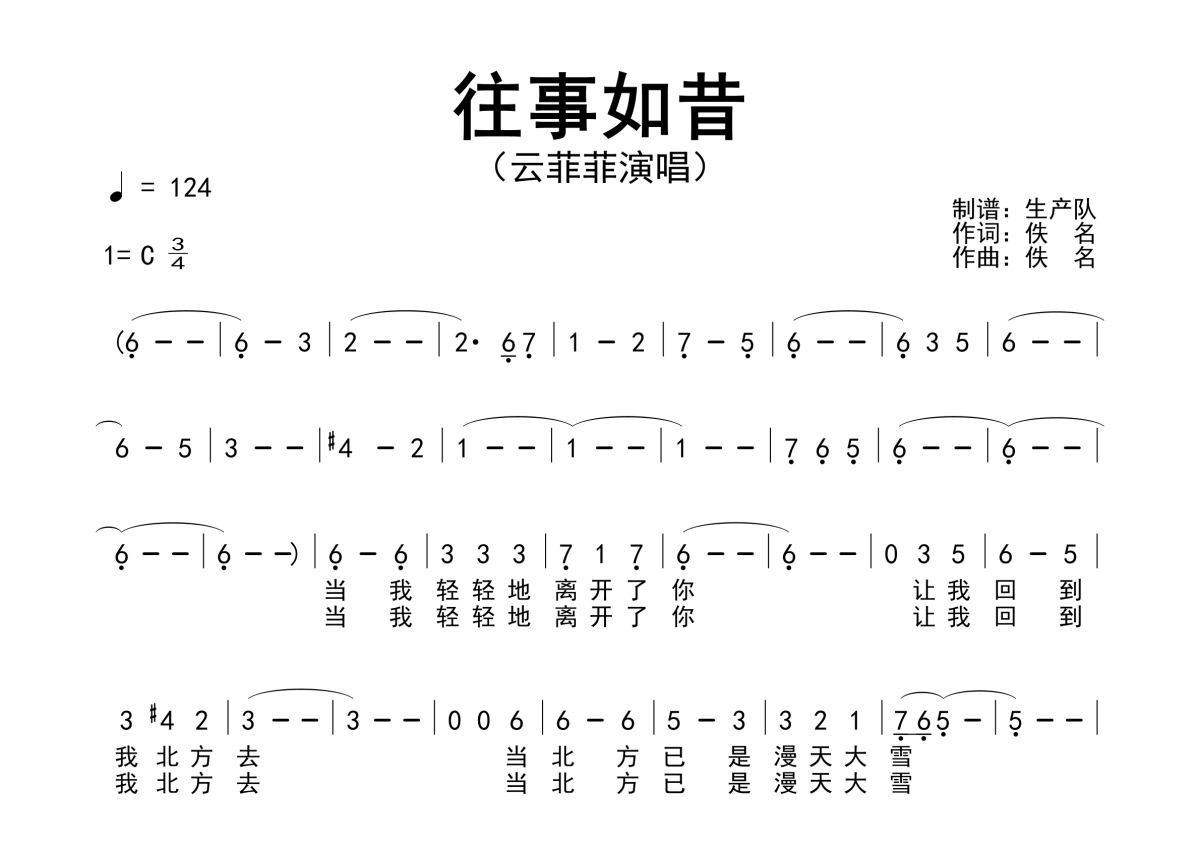 《往事如昔》是云菲菲演唱的一首歌曲,简谱,拍号为3/4拍,歌曲速度为每分钟124拍,这份简谱共有一张高清图谱,图谱由 @生产队 编配上传云菲菲演唱的歌曲《往事如昔》简谱。