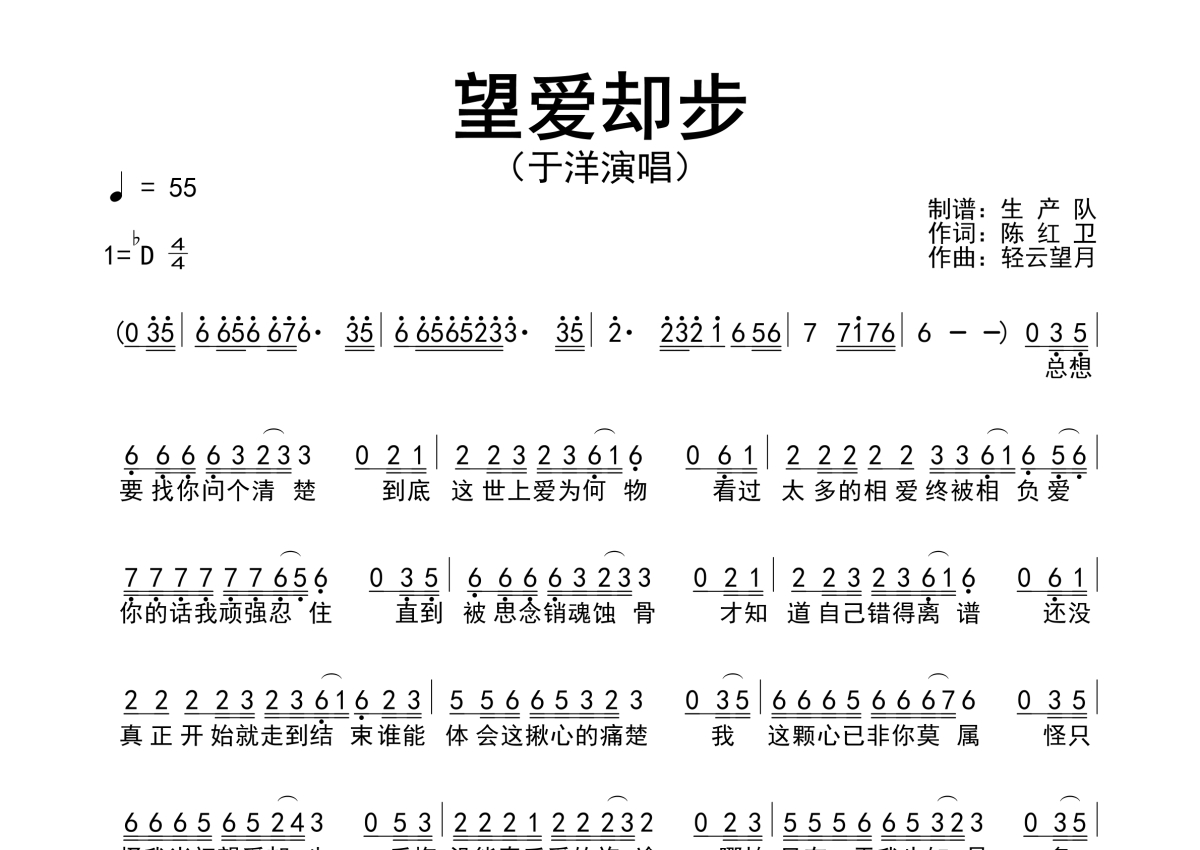 《望爱却步》是于洋演唱的一首歌曲,简谱,拍号为4/4拍,歌曲速度为每分钟55拍,这份简谱共有一张高清图谱,图谱由 @生产队 编配上传于洋演唱的歌曲《望爱却步》简谱。