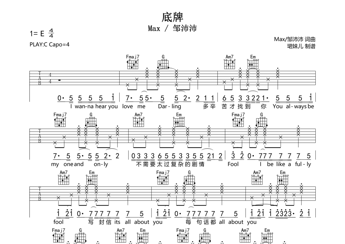 底牌吉他谱 - Max/邹沛沛 - C调弹唱六线谱