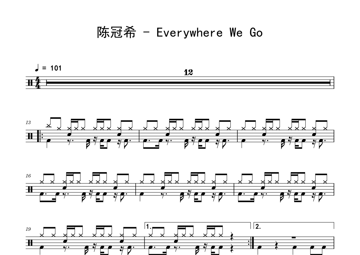 《Everywhere We Go》是陈冠希演唱的一首歌曲,这份架子鼓谱共有三张高清图谱,图谱由 @Sawubona 编配上传,图谱使用五线谱编配,使用这份Everywhere We Go架子鼓谱,你将能够轻松地敲打出这首陈冠希的Everywhere We Go,快来尝试吧。