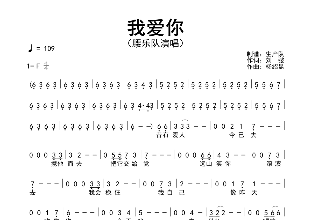 《我爱你》是腰乐队演唱的一首歌曲,简谱,拍号为4/4拍,歌曲速度为每分钟109拍,这份简谱共有一张高清图谱,图谱由 @生产队 编配上传腰乐队演唱的歌曲《我爱你》简谱。