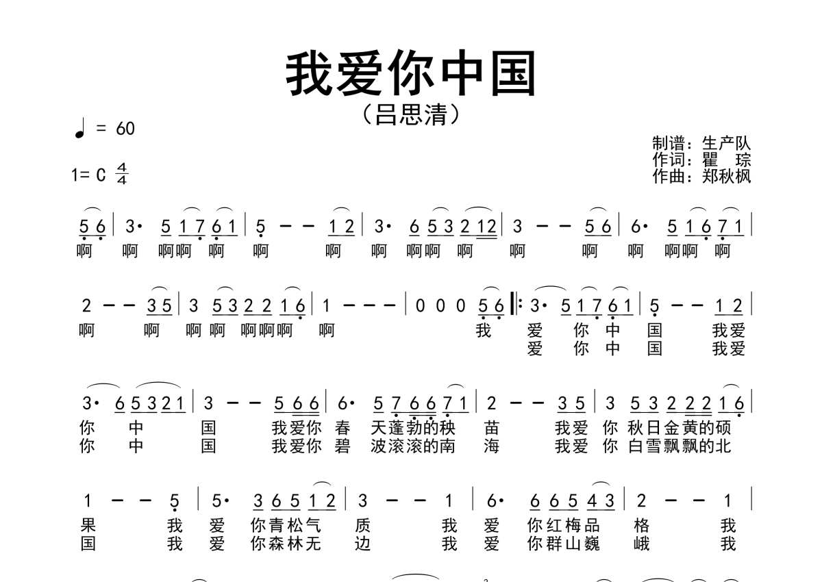 《我爱你中国》是吕思清演唱的一首歌曲,简谱,拍号为4/4拍,歌曲速度为每分钟60拍,这份简谱共有一张高清图谱,图谱由 @生产队 编配上传吕思清演奏的歌曲《我爱你中国》简谱。