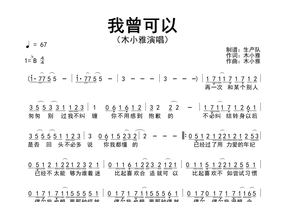 《我曾可以》是木小雅演唱的一首歌曲,简谱,拍号为4/4拍,歌曲速度为每分钟67拍,这份简谱共有一张高清图谱,图谱由 @生产队 编配上传木小雅演唱的歌曲《我曾可以》简谱。