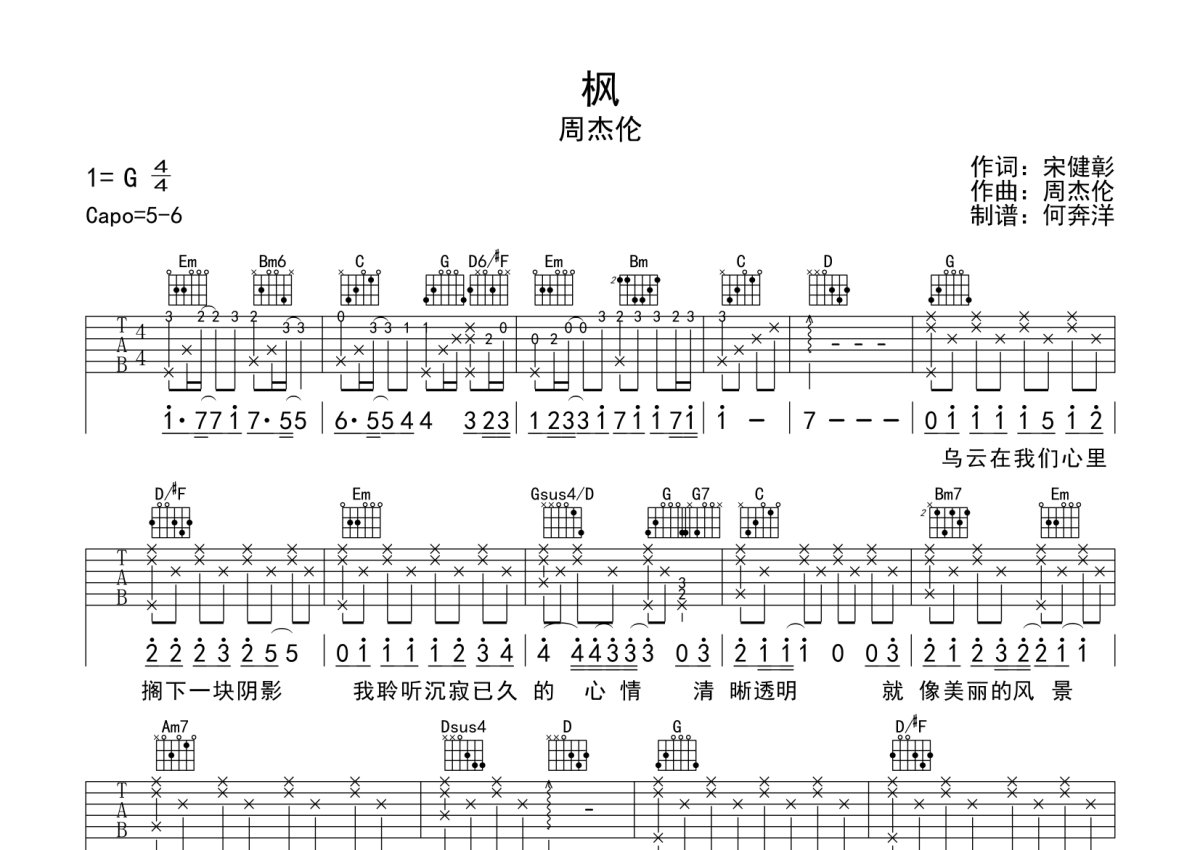 周杰伦《枫》吉他谱 - G调弹唱六线谱