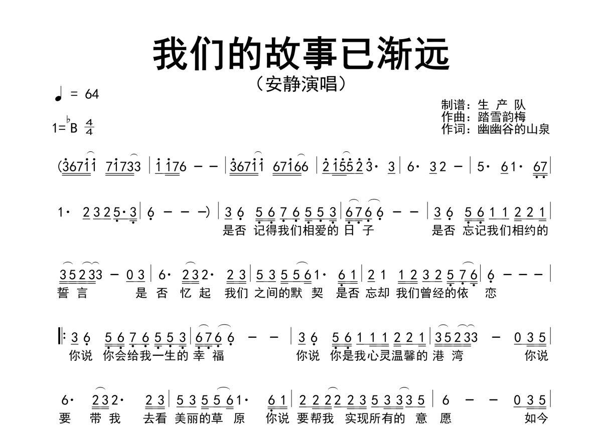 《我们的故事已渐远》是安静演唱的一首歌曲,简谱,拍号为4/4拍,歌曲速度为每分钟64拍,这份简谱共有一张高清图谱,图谱由 @生产队 编配上传安静演唱的歌曲《我们的故事已渐远》简谱。
