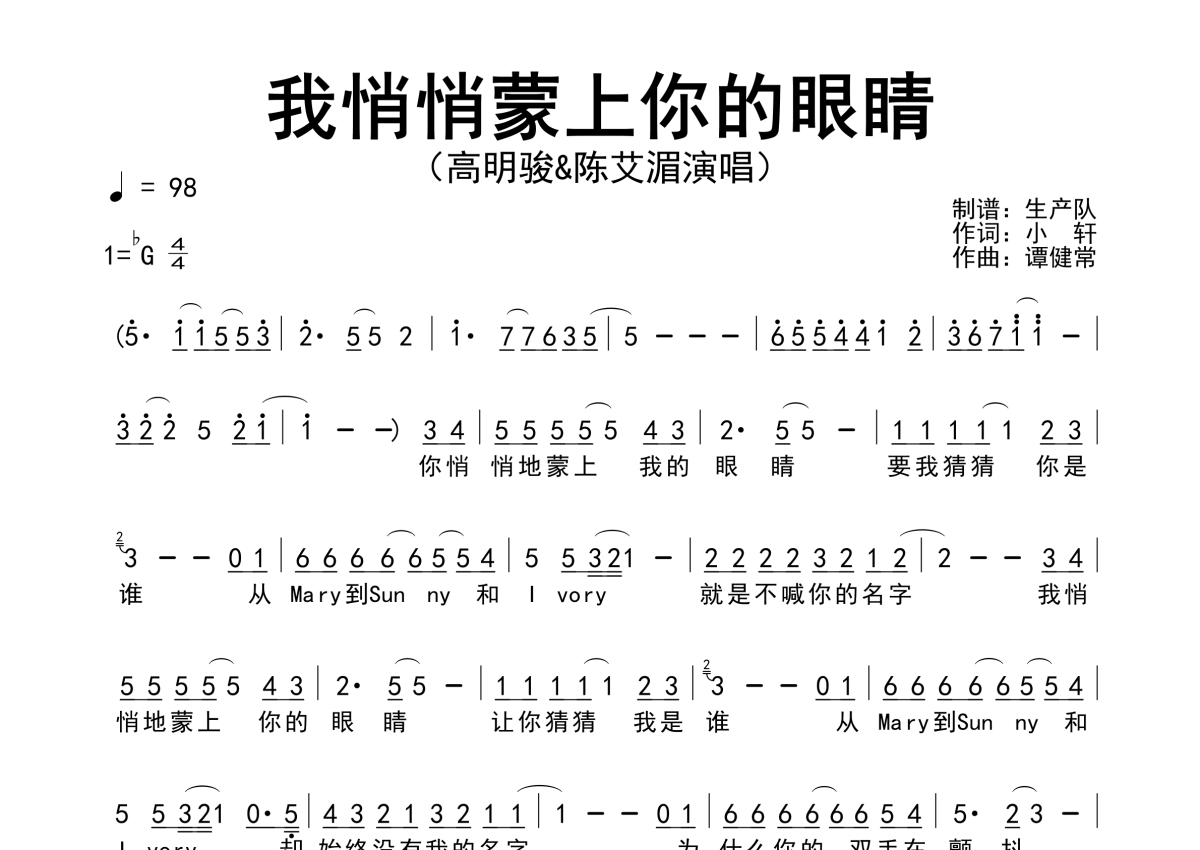 《我悄悄蒙上你的眼睛》是高明骏/陈艾湄演唱的一首歌曲,简谱,拍号为4/4拍,歌曲速度为每分钟98拍,这份简谱共有一张高清图谱,图谱由 @生产队 编配上传高明骏/陈艾湄演唱的歌曲《我悄悄蒙上你的眼睛》简谱。