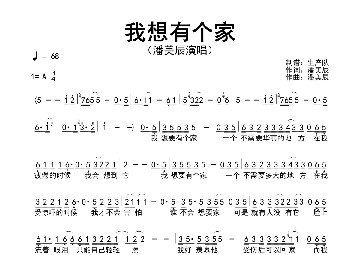 《我想有个家》是潘美辰演唱的一首歌曲,简谱,拍号为4/4拍,歌曲速度为每分钟68拍,这份简谱共有一张高清图谱,图谱由 @生产队 编配上传潘美辰演唱的歌曲《我想有个家》简谱。