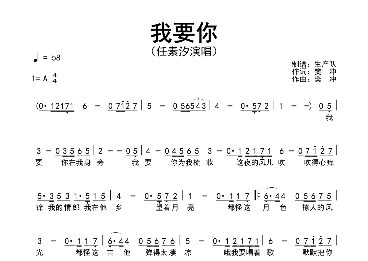 《我要你》是任素汐演唱的一首歌曲,简谱,拍号为4/4拍,歌曲速度为每分钟58拍,这份简谱共有一张高清图谱,图谱由 @生产队 编配上传任素汐演唱的歌曲《我要你》简谱。