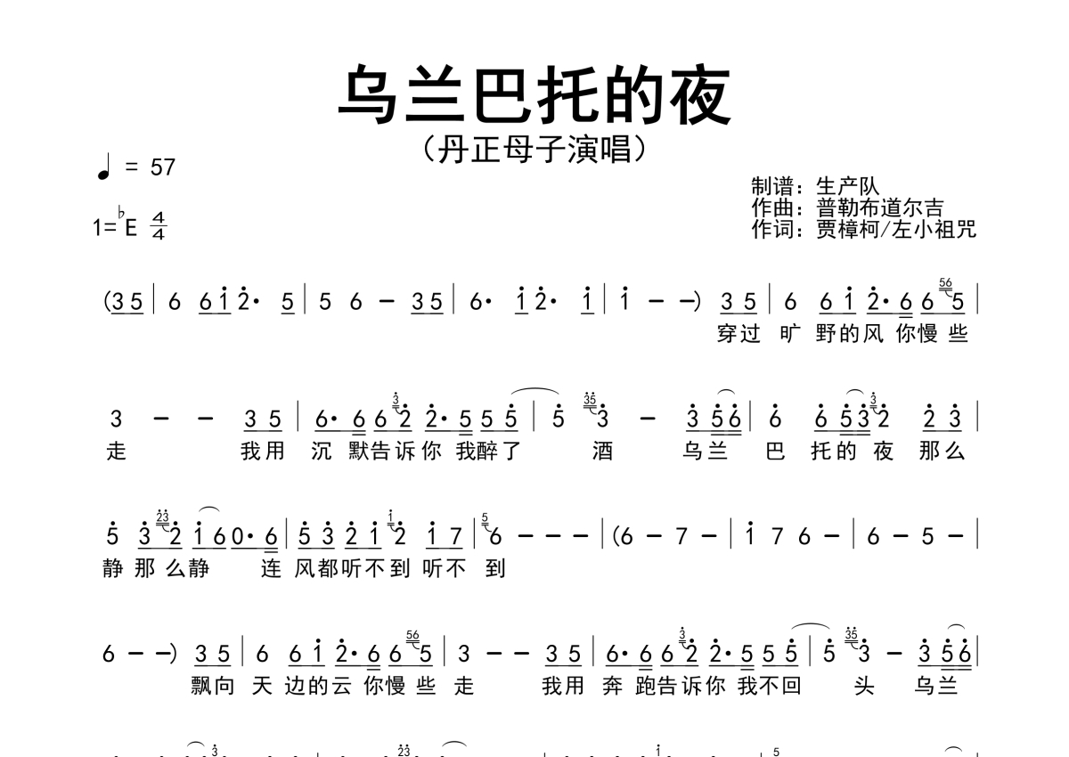 《乌兰巴托的夜》是丹正母子演唱的一首歌曲,简谱,拍号为4/4拍,歌曲速度为每分钟57拍,这份简谱共有一张高清图谱,图谱由 @生产队 编配上传丹正母子演唱的歌曲《乌兰巴托的夜》简谱。