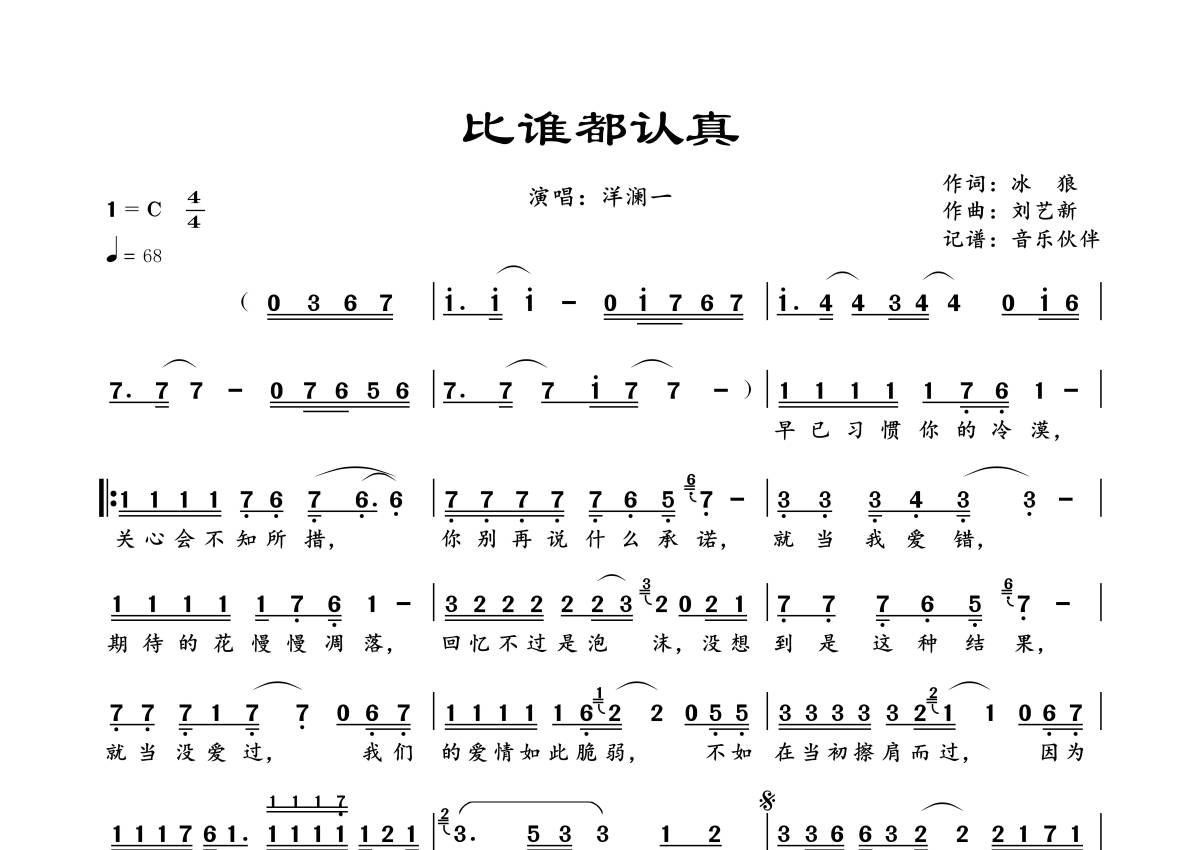 《比谁都认真》是洋澜一演唱的一首歌曲,拍号为4/4拍,歌曲速度为每分钟68拍,这份简谱共有一张高清图谱,图谱由 @音乐伙伴 编配上传。