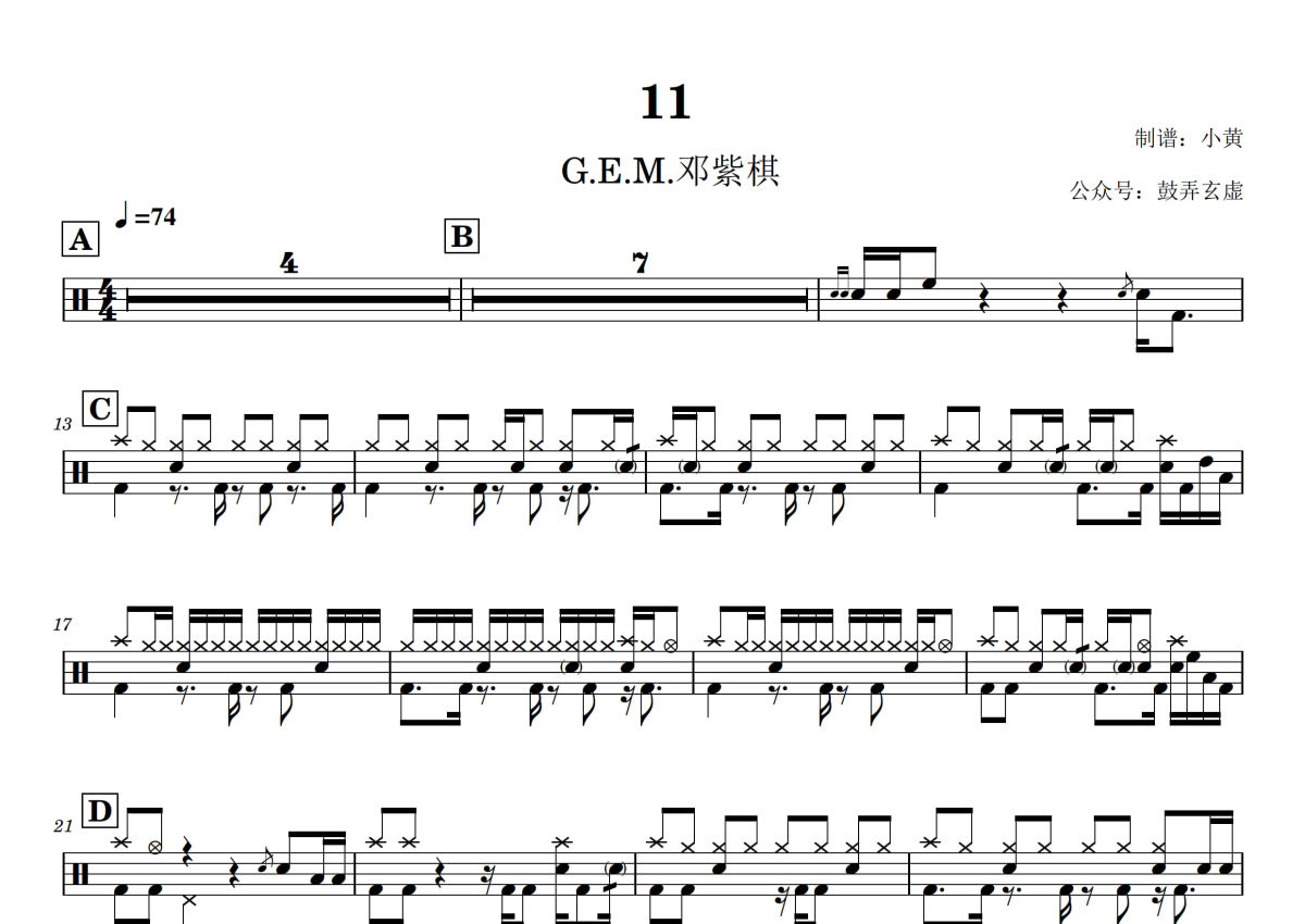 《11》是邓紫棋演唱的一首歌曲,拍号为4/4拍,歌曲速度为每分钟74拍,这份架子鼓谱共有两张高清图谱,图谱由 @小黄 编配上传,图谱使用五线谱编配,使用这份11架子鼓谱,你将能够轻松地敲打出这首邓紫棋的11,快来尝试吧。