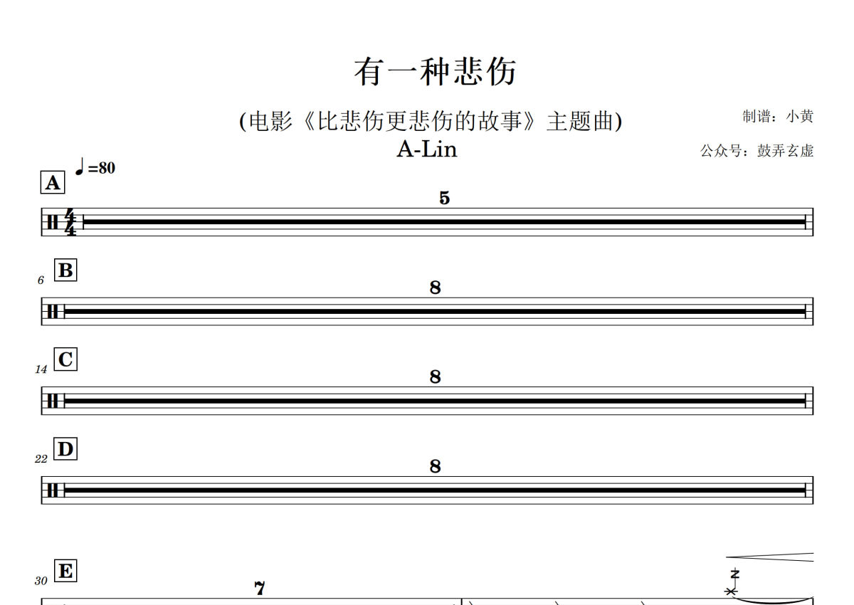 《有一种悲伤》是A-Lin演唱的一首歌曲,拍号为4/4拍,歌曲速度为每分钟80拍,这份架子鼓谱共有两张高清图谱,图谱由 @小黄 编配上传,图谱使用五线谱编配,使用这份有一种悲伤架子鼓谱,你将能够轻松地敲打出这首A-Lin的有一种悲伤,快来尝试吧。
