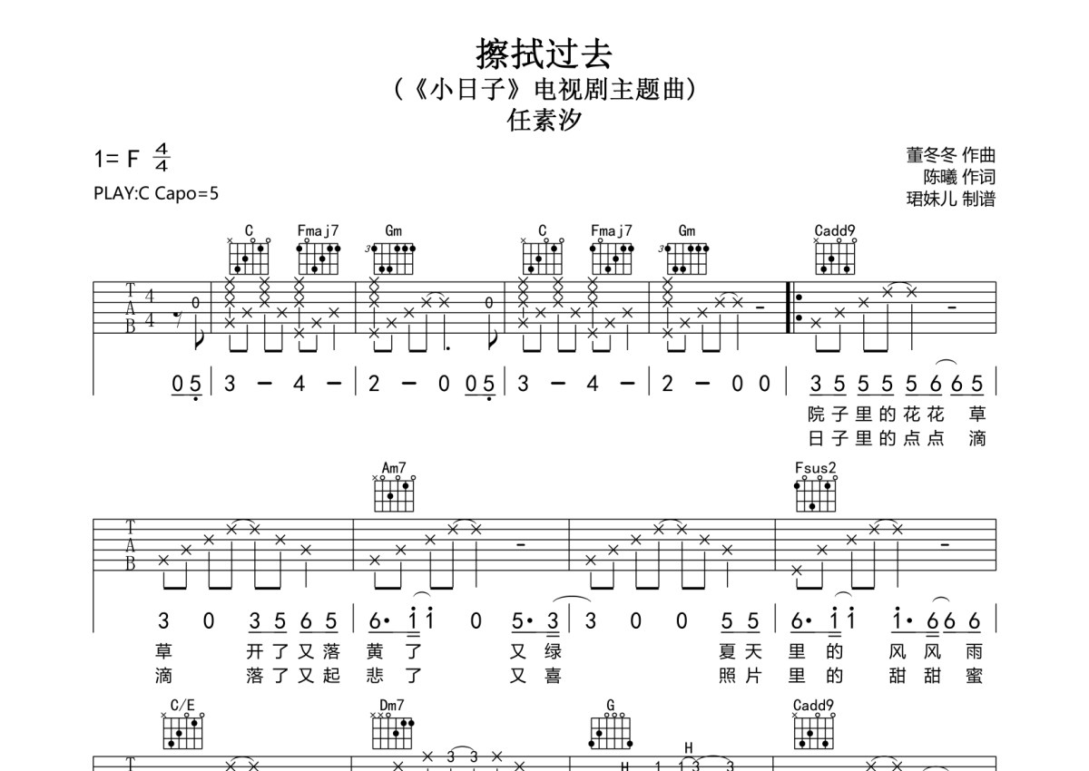 任素汐《擦拭过去》吉他谱 - C调弹唱六线谱