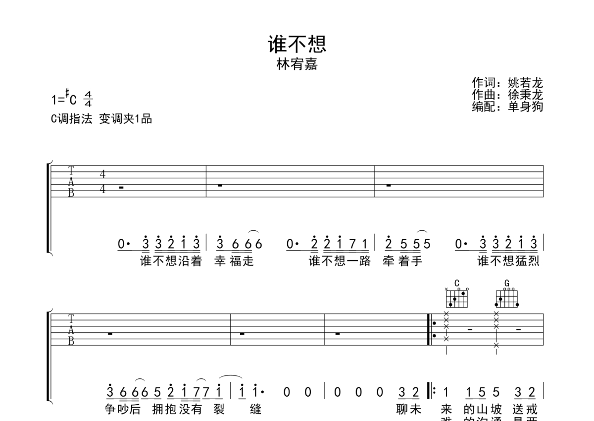 《谁不想》是林宥嘉演唱的一首歌曲,拍号为4/4拍,歌曲原调为Db调,但由于原调指法比较难,为了方便弹奏,本吉他谱采用的是C调指法编配,变调夹1品弹奏即为原调,当然也可以根据自己的音域改变变调夹位置,或者通过改变和弦调性,以方便自己弹奏,这份吉他谱共有三张高清图谱,图谱由 @单身狗 编配上传,图谱使用六线谱编配,包含吉他和弦指法、简谱以及歌词部分,使用这份谁不想吉他谱,可以让你更加方便地掌握这首歌曲的弹唱技巧,快来尝试吧。