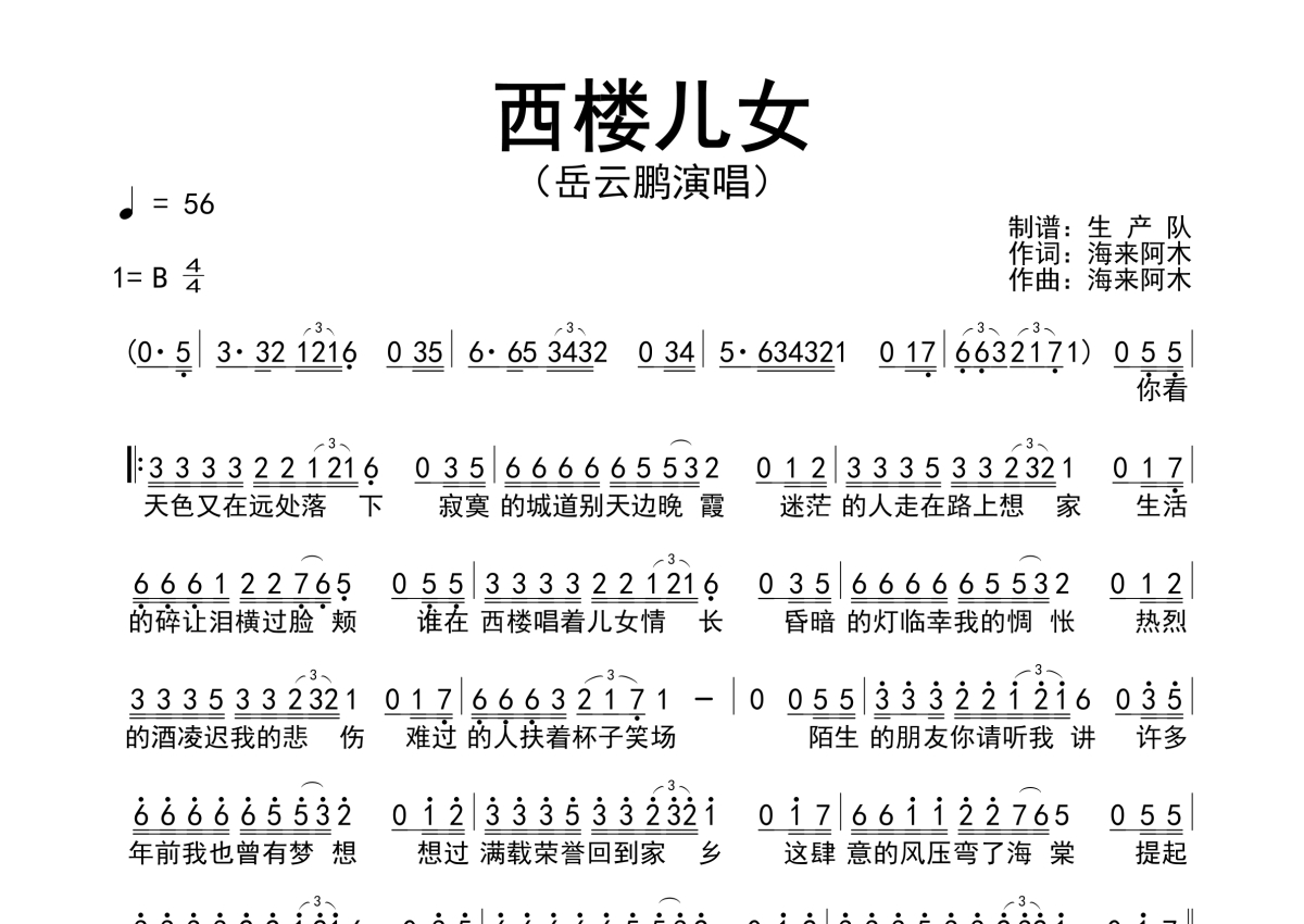 《西楼儿女》是岳云鹏演唱的一首歌曲,简谱,拍号为4/4拍,歌曲速度为每分钟56拍,这份简谱共有一张高清图谱,图谱由 @生产队 编配上传岳云鹏演唱的歌曲《西楼儿女》简谱。