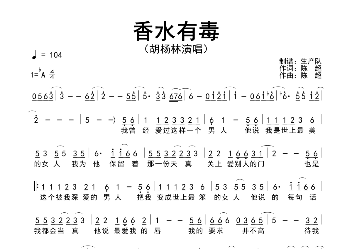 《香水有毒》是胡杨林演唱的一首歌曲,拍号为4/4拍,歌曲速度为每分钟104拍,这份简谱共有一张高清图谱,图谱由 @生产队 编配上传胡杨林演唱的歌曲《香水有毒》简谱。