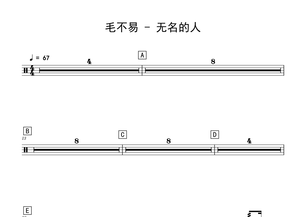 《无名的人》是毛不易演唱的一首歌曲,这份架子鼓谱共有两张高清图谱,图谱由 @Sawubona 编配上传,图谱使用五线谱编配,使用这份无名的人架子鼓谱,你将能够轻松地敲打出这首毛不易的无名的人,快来尝试吧。