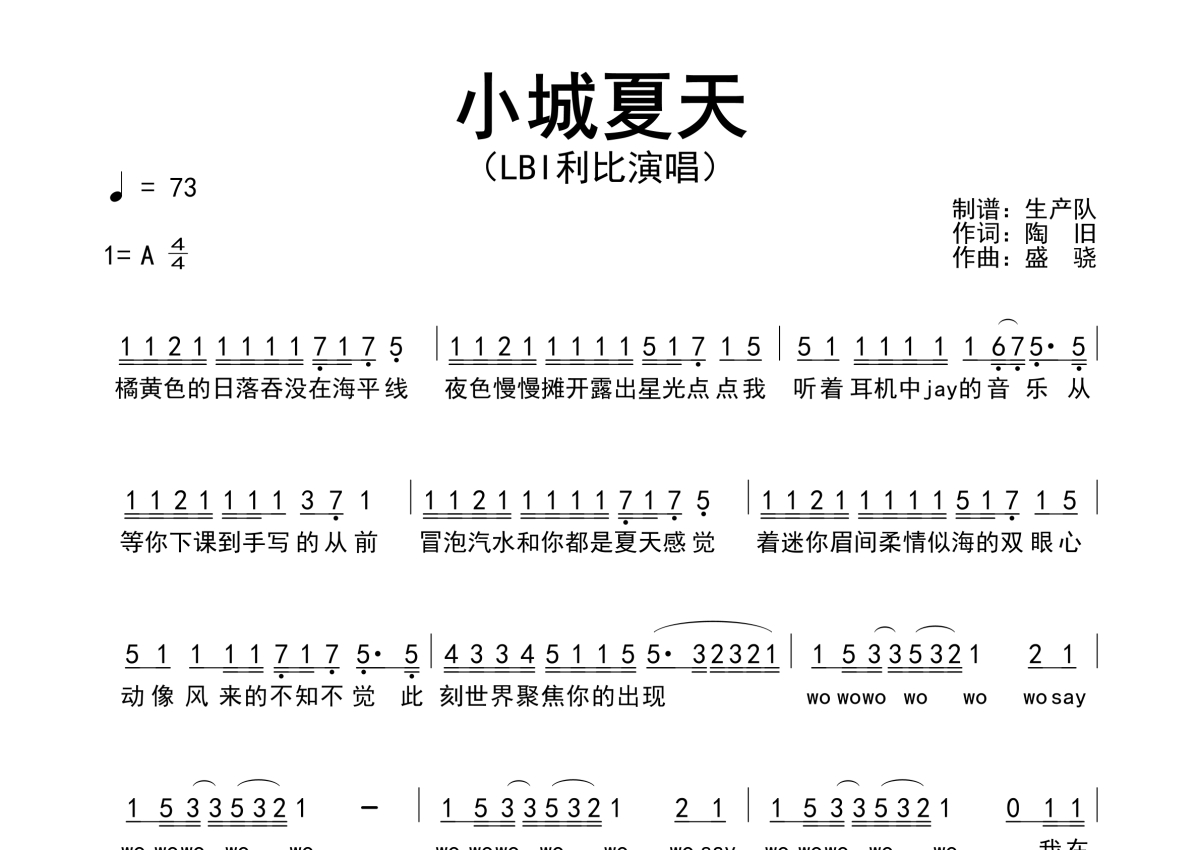 《小城夏天》是LBI利比演唱的一首歌曲,简谱,拍号为4/4拍,歌曲速度为每分钟73拍,这份简谱共有一张高清图谱,图谱由 @生产队 编配上传LBI利比演唱的歌曲《小城夏天》简谱。