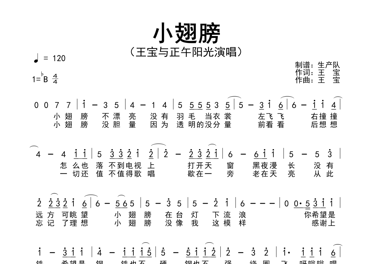 《小翅膀》是王宝与正午阳光演唱的一首歌曲,简谱,拍号为4/4拍,歌曲速度为每分钟120拍,这份简谱共有一张高清图谱,图谱由 @生产队 编配上传王宝与正午阳光演唱的歌曲《小翅膀》简谱。