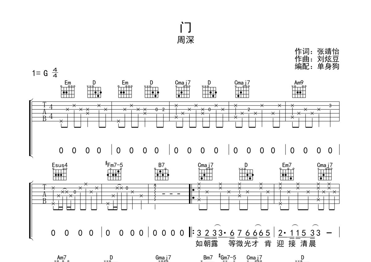 《门》是周深演唱的一首歌曲,拍号为4/4拍,歌曲原调为G调,本吉他谱采用的是G调指法编配,演奏时不需要使用变调夹即为原调,这份吉他谱共有三张高清图谱,图谱由 @单身狗 编配上传,图谱使用六线谱编配,包含吉他和弦指法、简谱以及歌词部分,使用这份门吉他谱,可以让你更加方便地掌握这首歌曲的弹唱技巧,快来尝试吧。